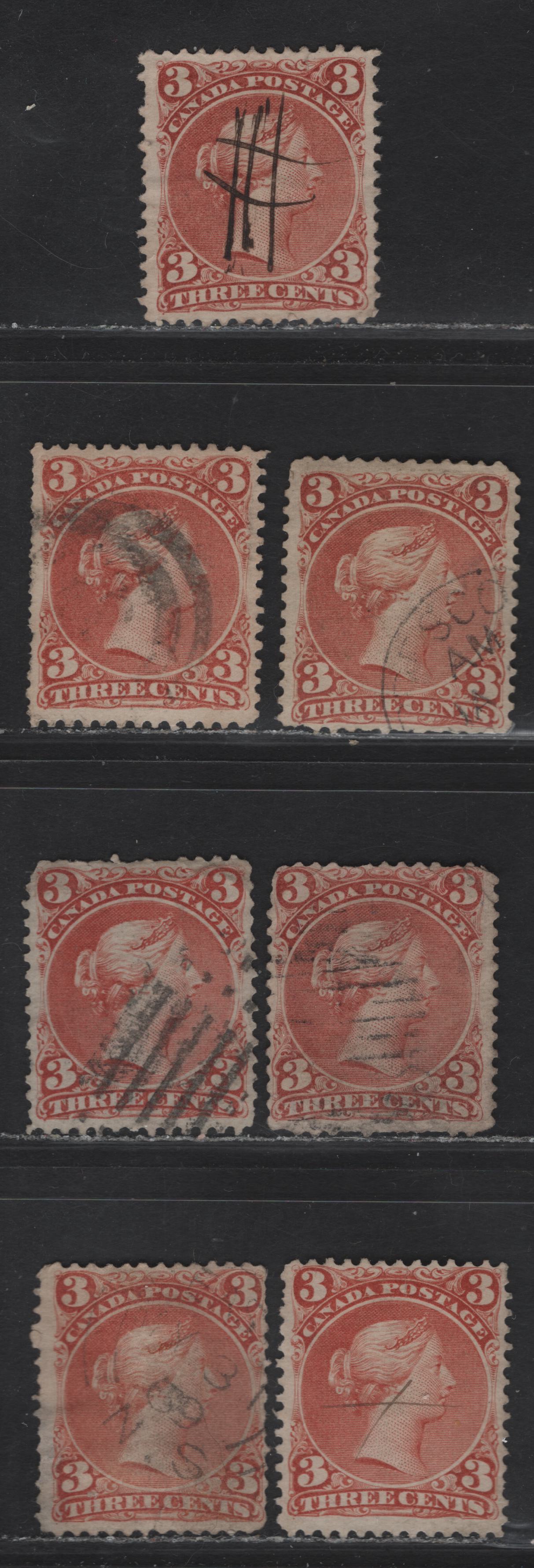 Lot 21 (C) Canada #25,ii 3c Rose Red & Deep Rose Red Queen Victoria, 1868-1876 Large Queen Issue, 7 Ungraded Used Singles, Papers FO-O (Duckworth 10), FO-M (Duckworth 4), FO-AA & FO-BB, Perfs 12, 12x12.1. 11.9x12, 12x11.9 & 12.1x12