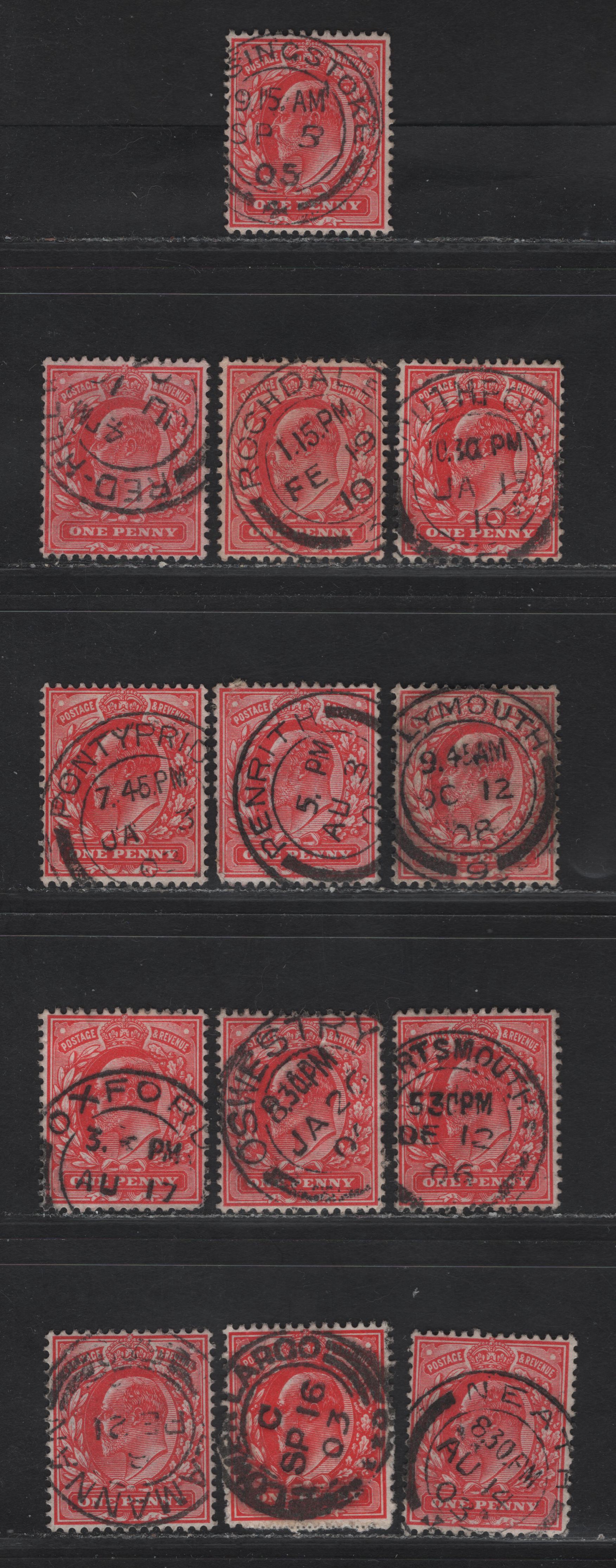 fine/very fine used singles of the 1d scarlet - deep bright scarlet King Edward VII from the 1902-1910 King Edward VII Issue, l-s single bar barell CDS village/town cancels.