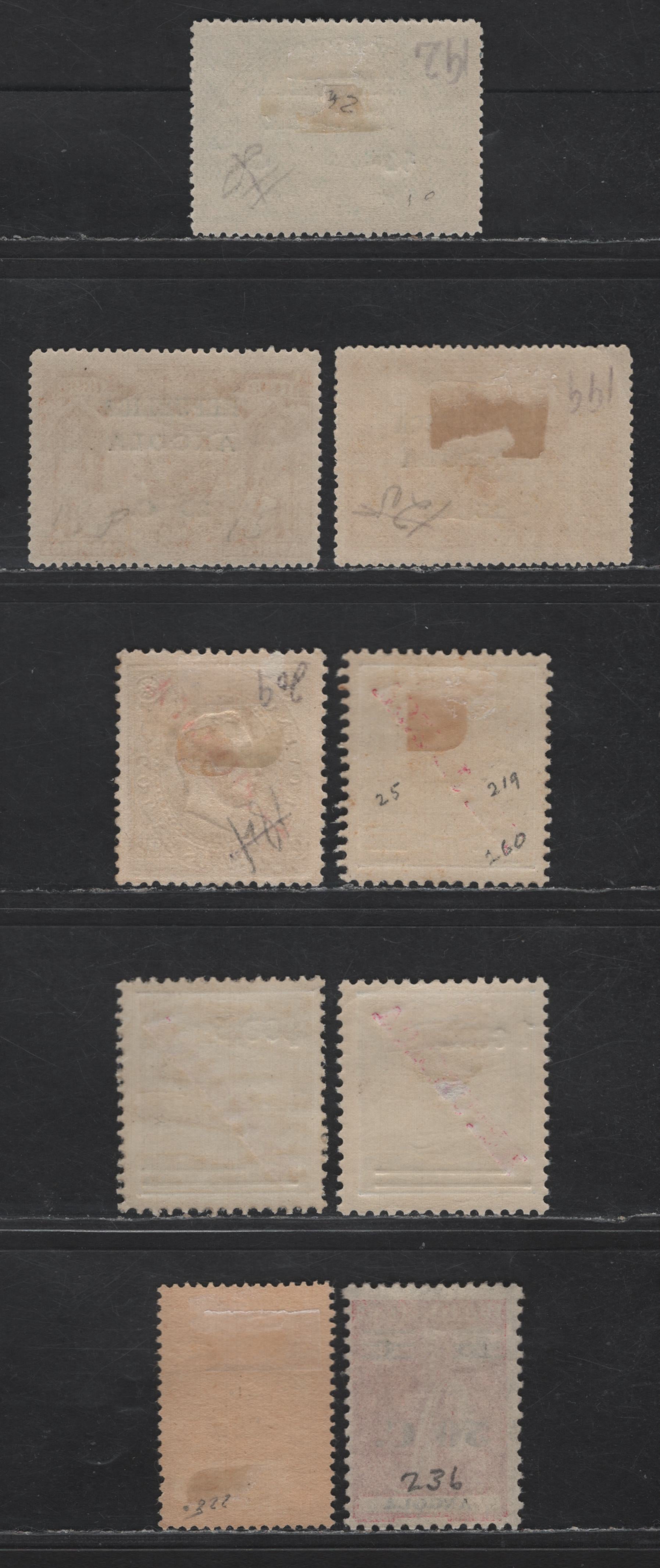 Lot 218 Angola SC#192, 198-199, 209, 219, 226-228, 236 1/4c on 2.5r - 50c on 60c Blue Green - Deep Rose Republica, 1913-1931 Republica Overprinted & Surcharge Issue, 9 F/VFOG/NH & Unused Singles, 228 & 236 Have No Gum