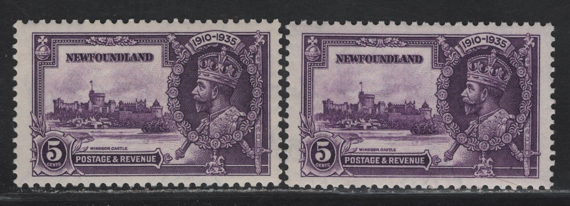 Lot 223 Newfoundland #227 5c Violet & Deep Violet KGV & Windsor Castle, 1935 Silver Jubilee Issue, 2 VFNH Singles