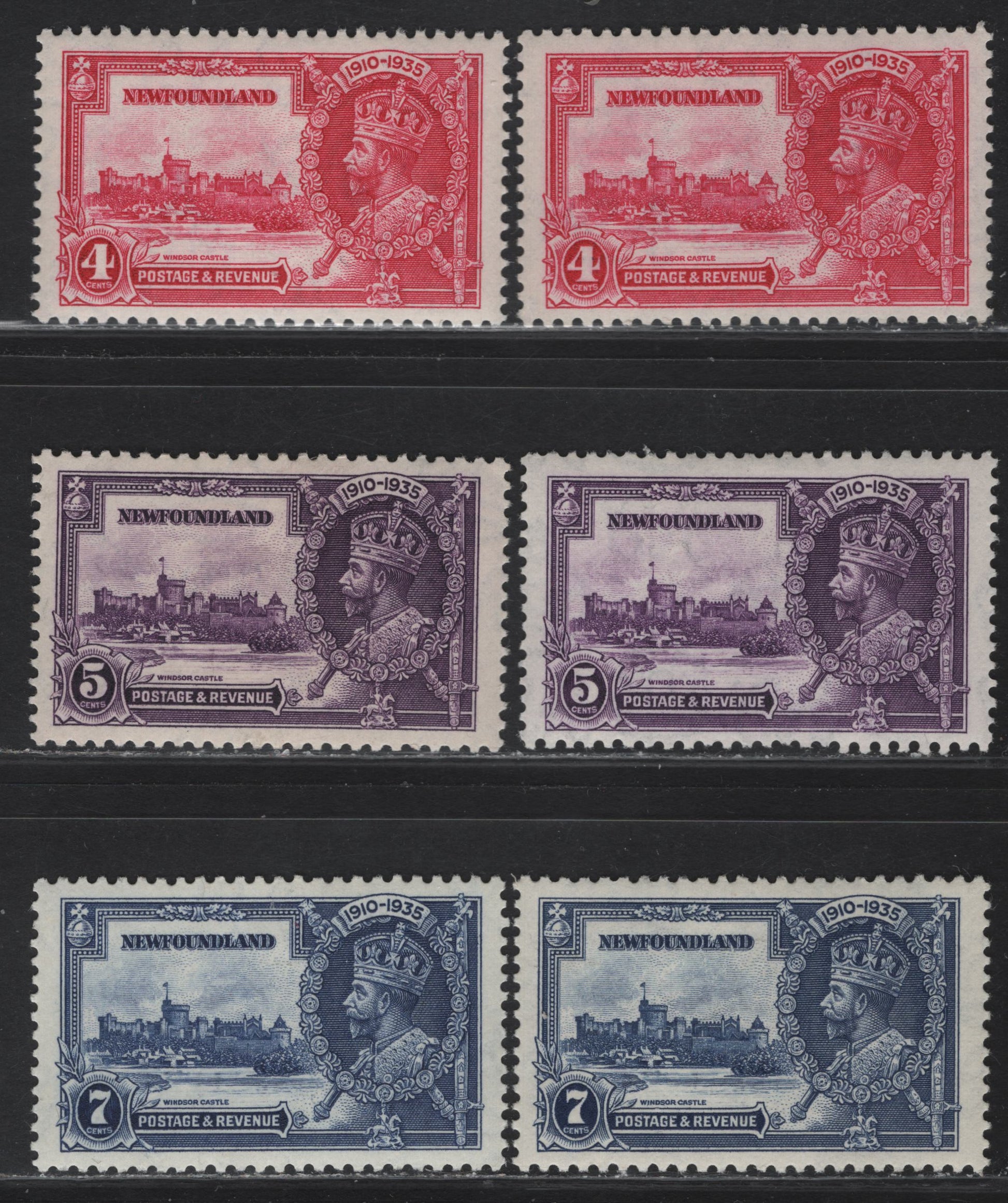 Lot 224 Newfoundland #226-228 4c - 7c Bright Rose - Dark Blue KGV & Windsor Castle, 1935 Silver Jubilee Issue, 6 VFOG Singles, Two Shades Of Each