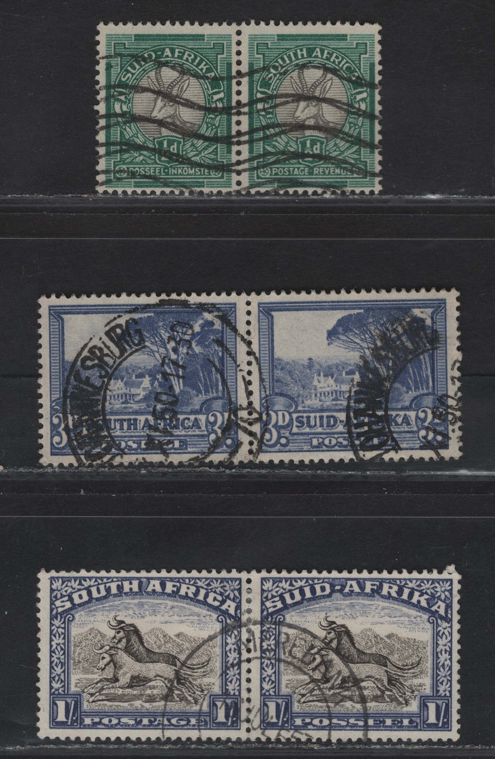 3 fine/very fine used horizontal pairs of the 1/2d - 1/- gray & green - blackish brown & ultramarine Springbok - Black & Blue Wildebeest from the 1947-1954 Screened Rotogravure Pictorial Issue.