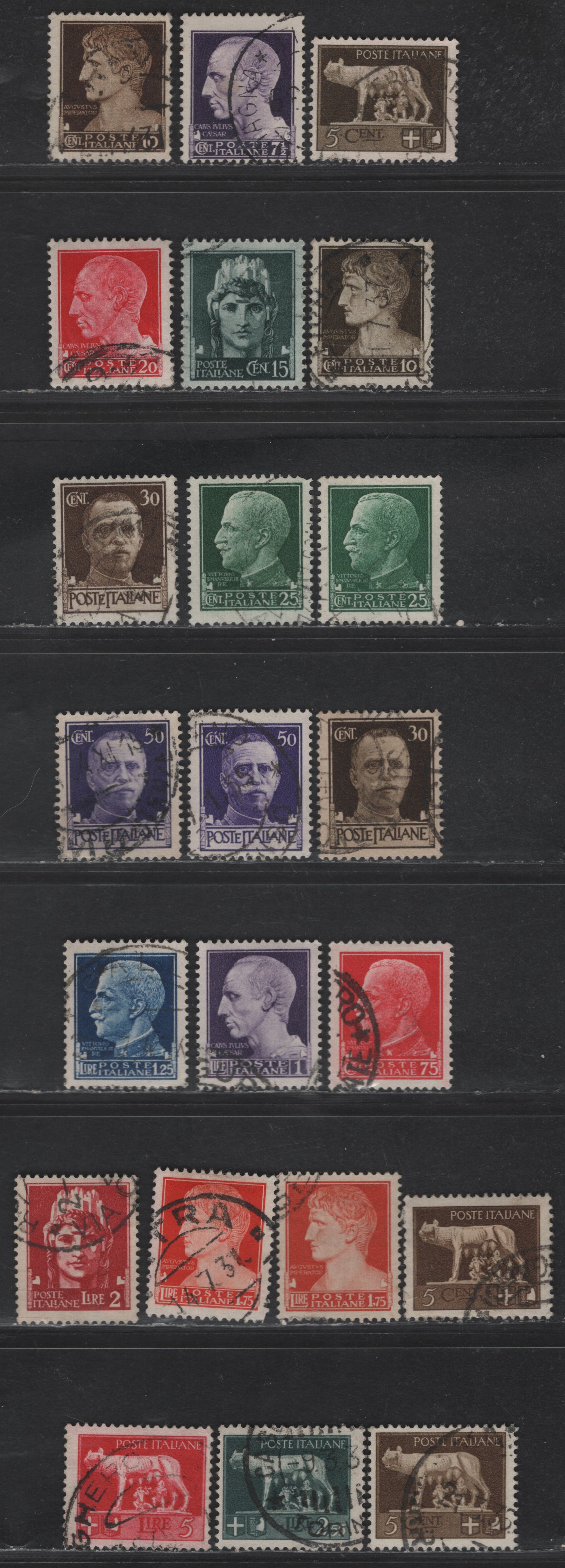 Lot 228 Italy SC#213-219. 221-227 5c - 5l Olive Brown - Rose Red Ceasar, Italia & Emmanuel III, 1929-1942 Ceasar, Italia & Emmanuel III Definitives, 22 Fine/Very Fine Used Singles, Includes Shade Varieties