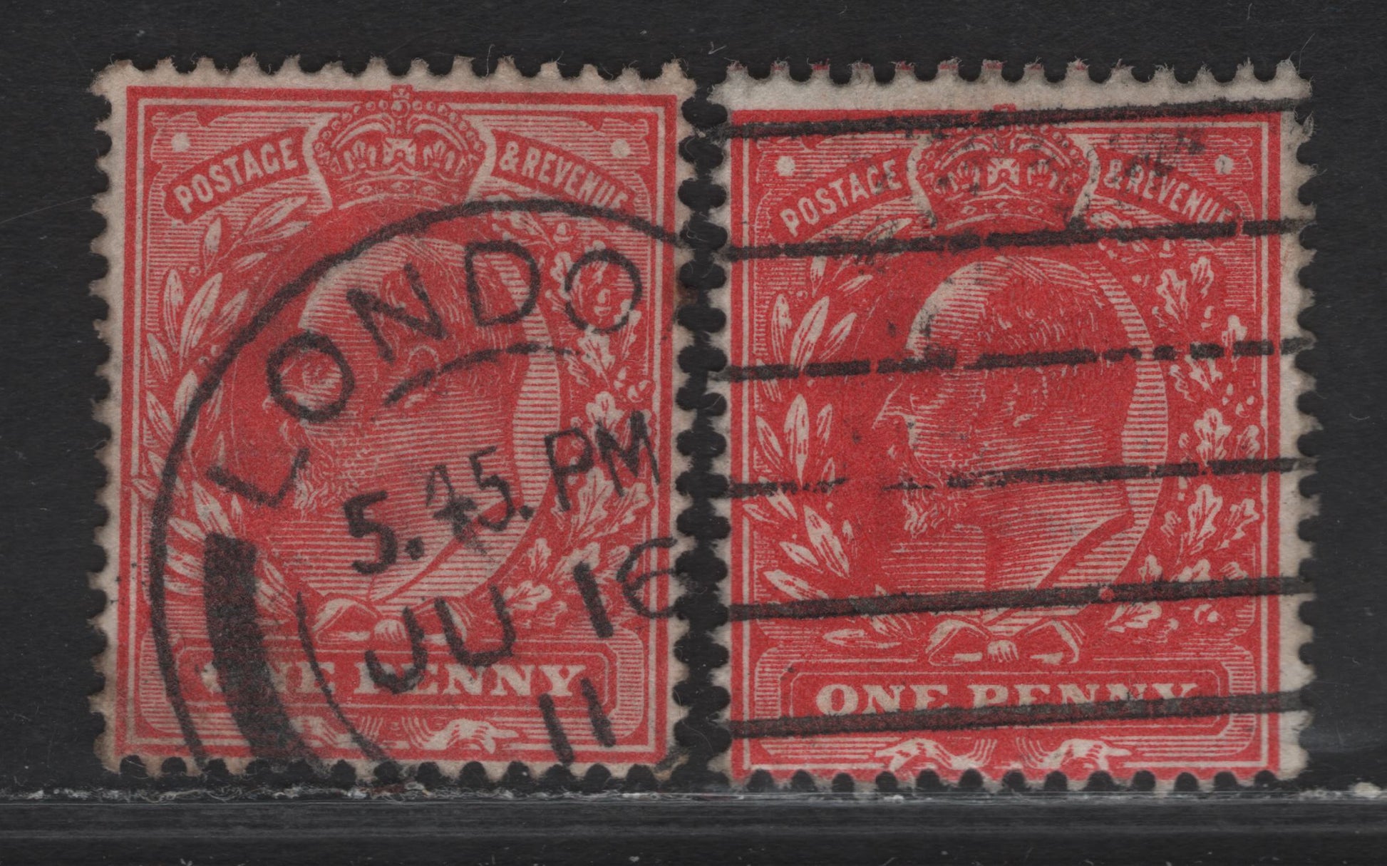 2 very good/fine used singles of the 1d rose red & intense rose red King Edward VII from the 1902-1910 King Edward VII Issue, Harrison printing, perf 14.