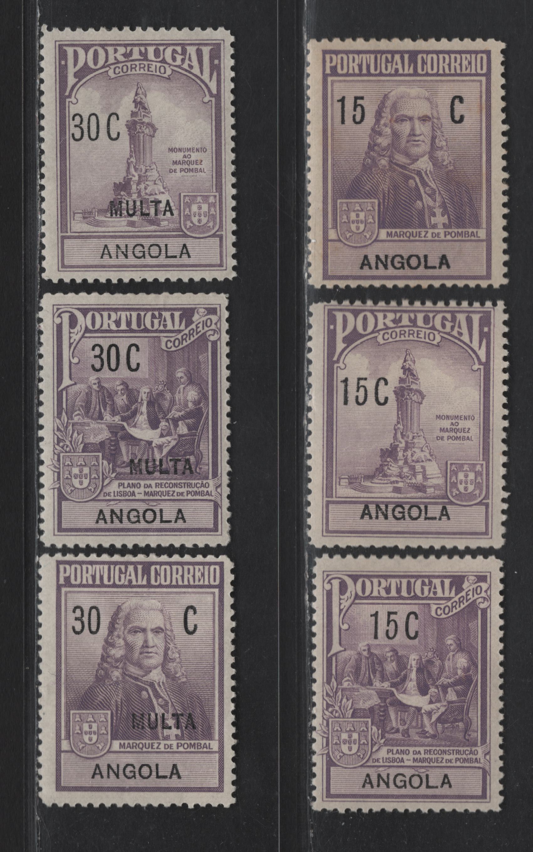 Lot 231 Angola SC#RA1-3, RAJ1-3 15c - 30c Purple Pombal Issue, 1925 Postal Tax Issue, 6 F/VFOG Singles