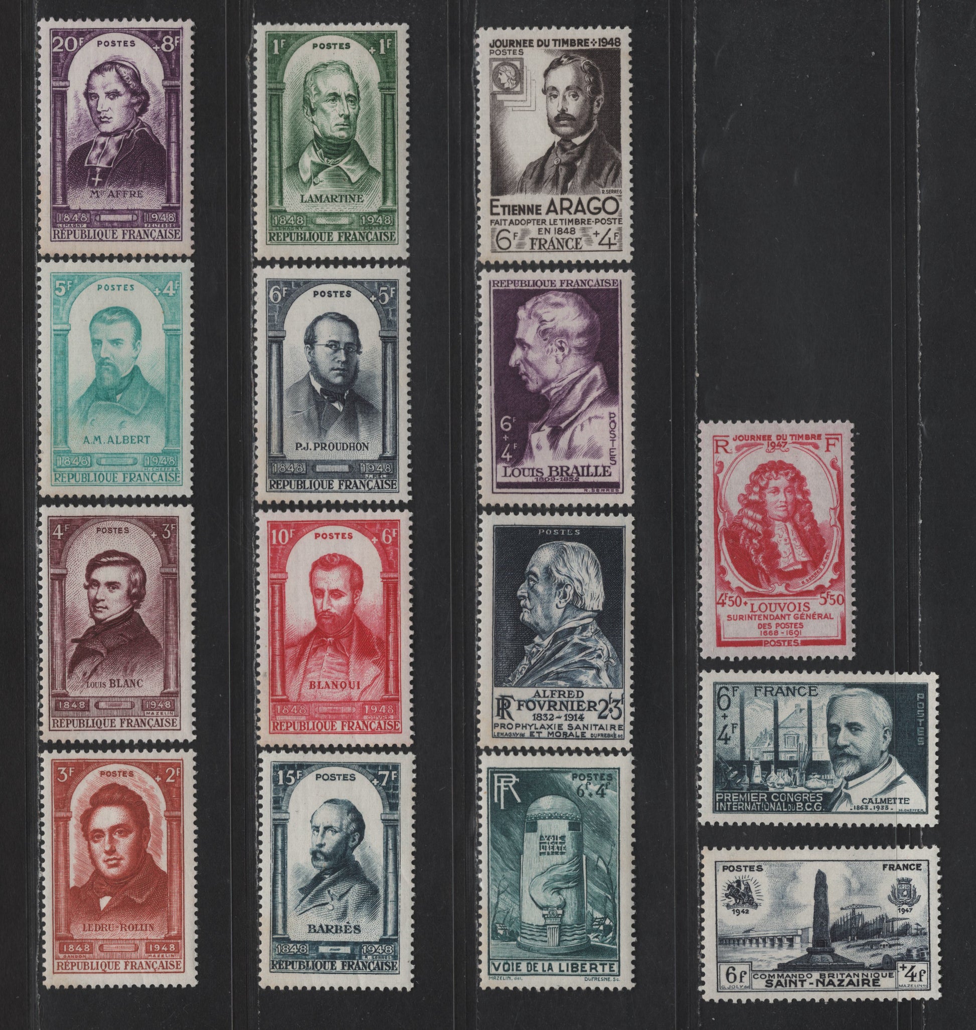 Lot 232 France SC#B218-B232 4.50fr+5.5fr - 6fr+4fr Carmine Rose - Dark Greenish Blue Francois Michel - Dr. Leon Charles Albert Calmette, 1947 Semi Postal Issues, 15 VFOG Singles