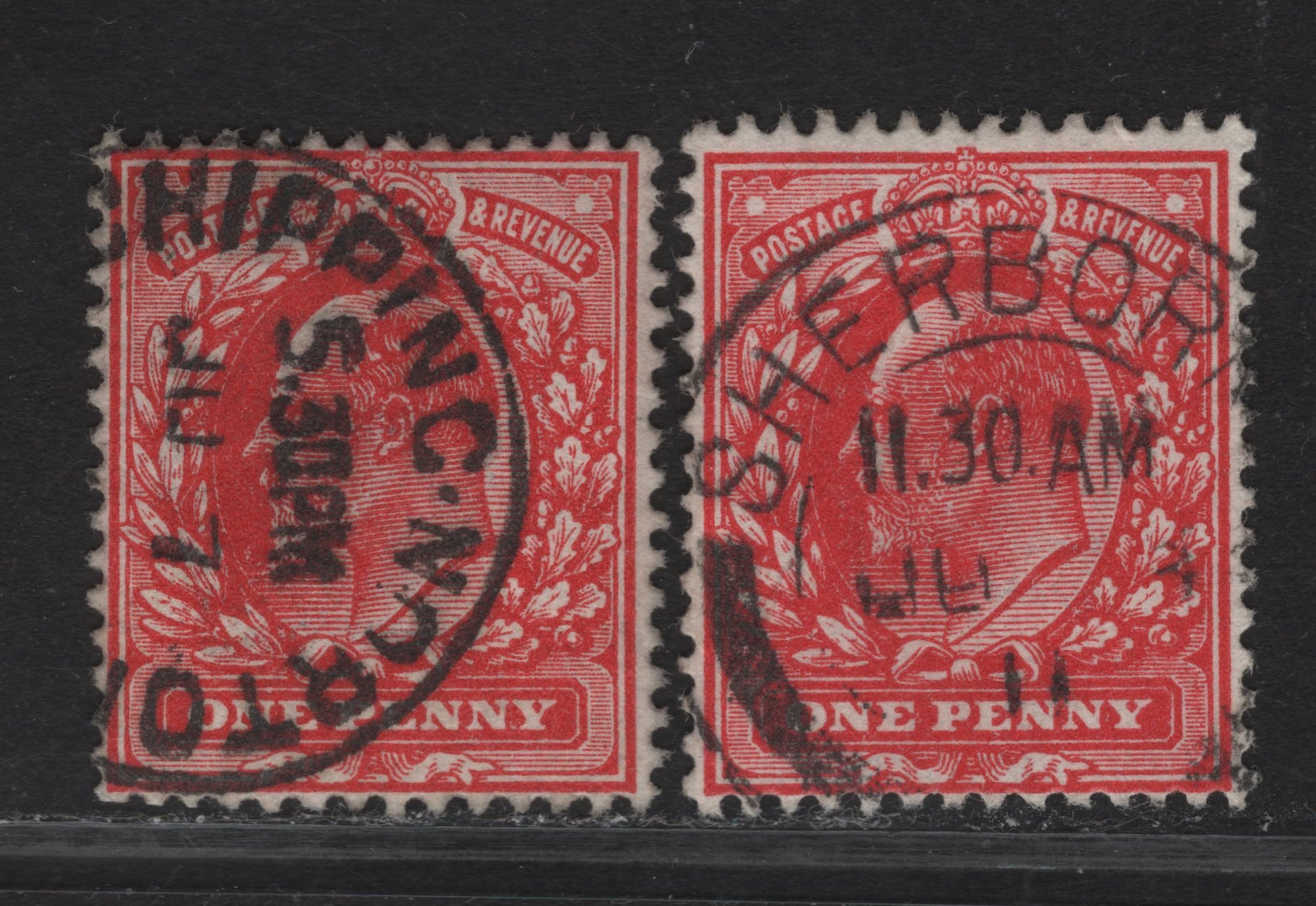 Lot 233 Great Britain SC#128a (SG#273) 1d Deep Rose Red & Deep Scarlet Red King Edward VII, 1902-1910 King Edward VII Issue, 2 Very Fine Used Singles, Harrison Printing, Perf 14, June 1911Sherbor… Cancel & Chipping - Norton CDS.