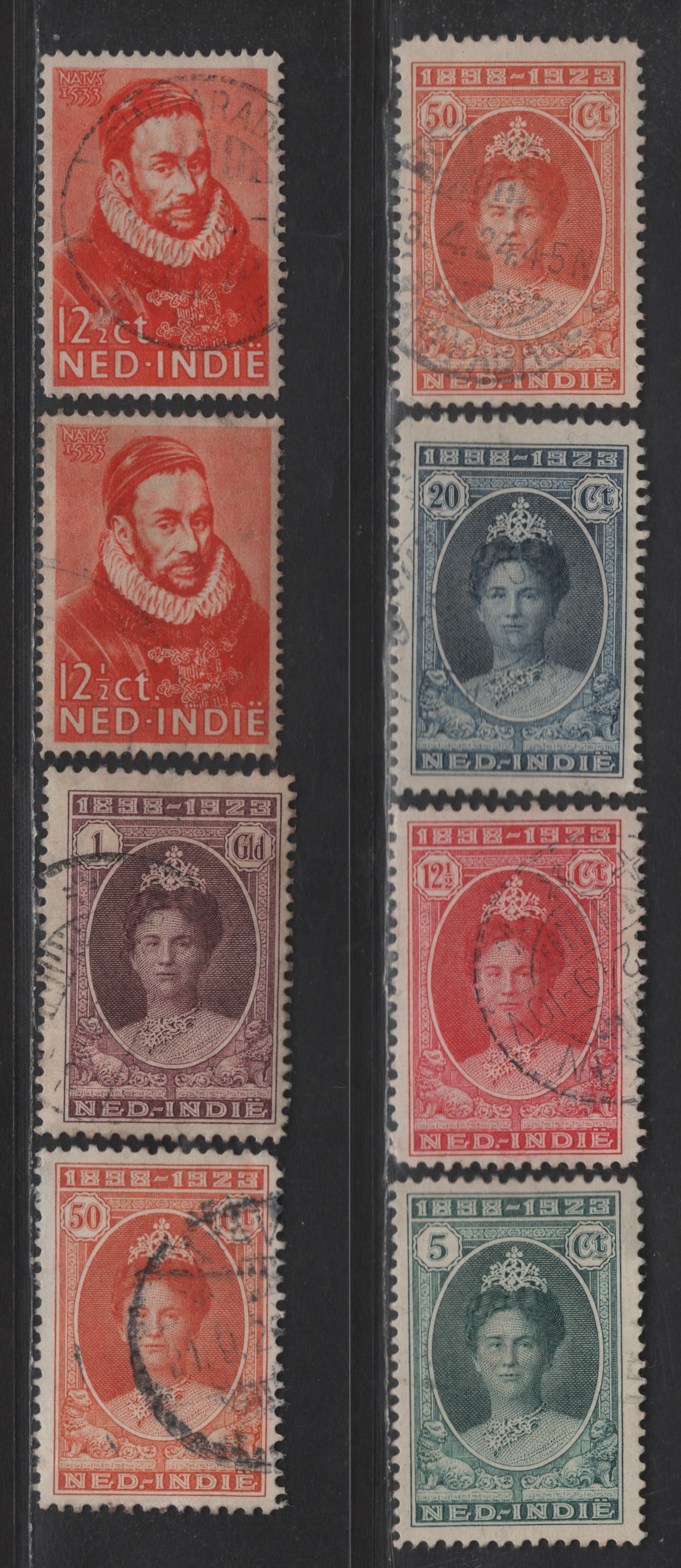 Lot 233 Netherlands Indies SC#151-153, 154b-c, 155, 157 5c - 1g Myrtle Green - Brown Violet Queen Wilhelmina - Prince William I, 1923 Queen Wilhelmina's Ascension & Birth of Prince William I Issues, 8 Fine/Very Fine Used Singles, Perf Variations