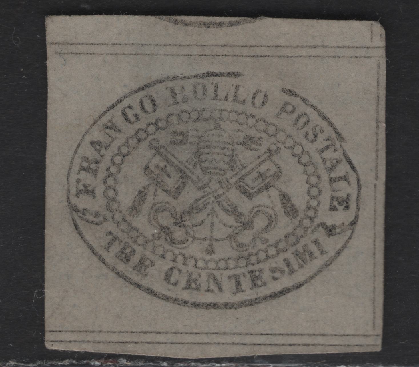 Lot 24 Roman States SC#13 3c Black on Gray Papal Arms, 1867 Arms Issue, A Fine Unused Single, Glazed Paper, Full To Jumbo Margins & Double Dividing Lines Visible On 3 Sides, Showing Continuous Dividing Lines, Proving This Is Genuine.