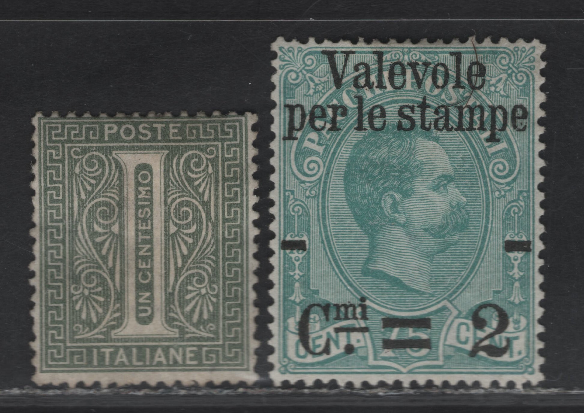 Lot 242 Italy SC#24, 61 1c - 2c on 75c Gray Green - Blue Green Numeral - Overprinted Humbert I, 1863-1890 Numeral - Surcharged Parcel Post Issues, 2 FOG Singles, The Parcel Post Issue Has No Gum