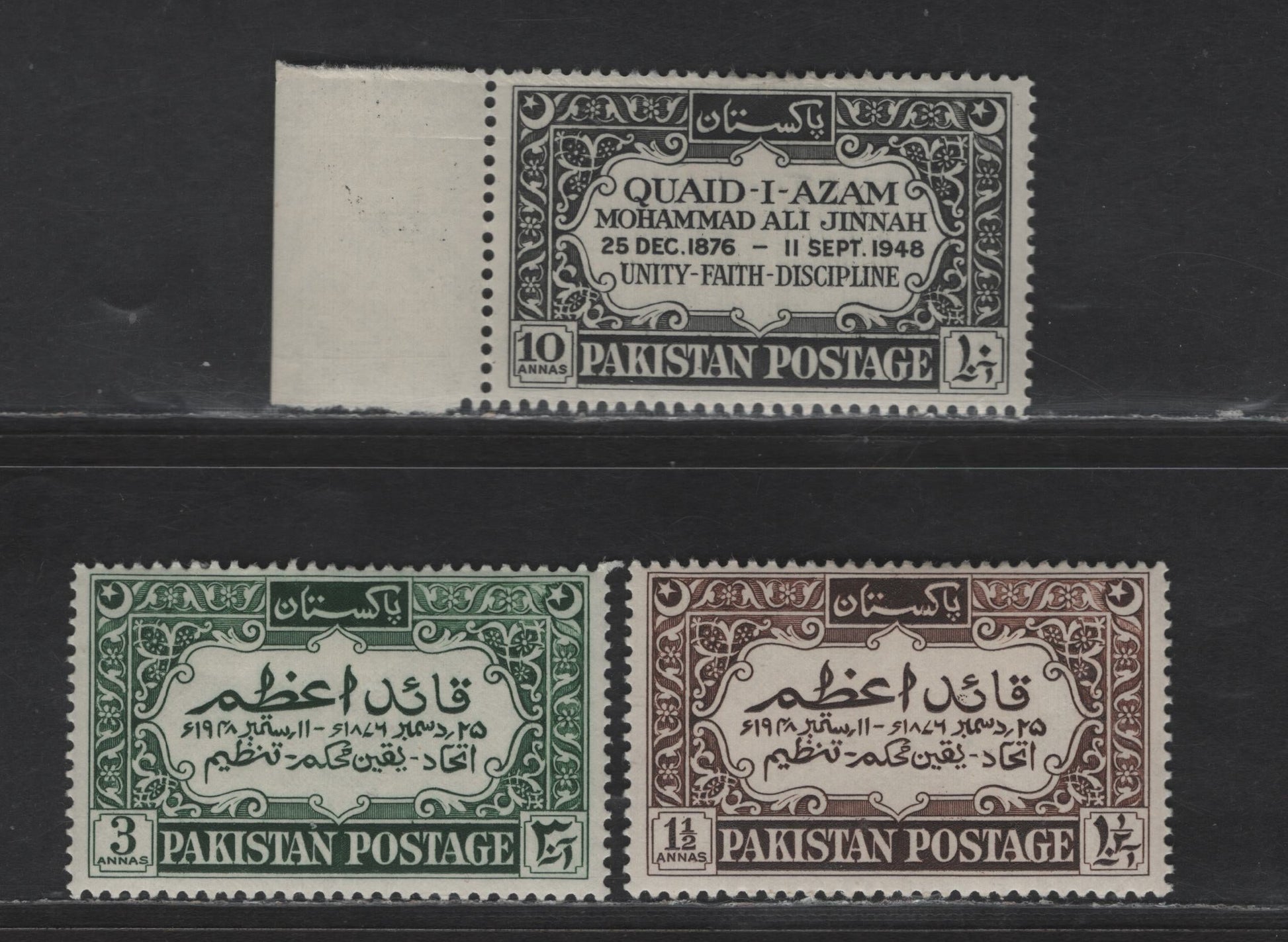 Lot 244 Pakistan SG#52-54 1.5a - 10a Brown - Black Writing, 1939 First Anniversary Of Death Of Mohammed Ali-Jinnah Issue, 3 VFOG Singles