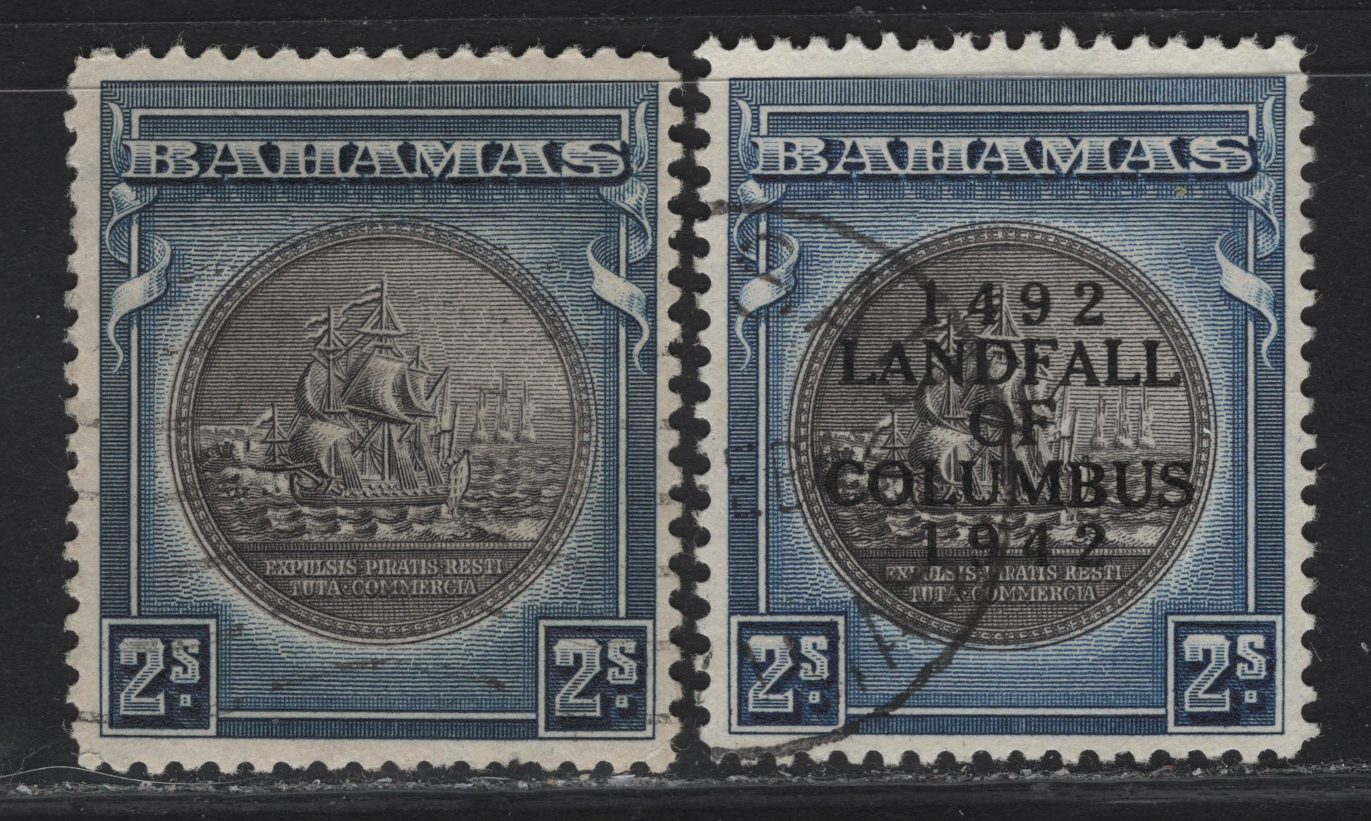 Lot 251 (C) Bahamas SG#131c, 172b 2/- Brownish Black & Steel Blue Badge of the Colony, 1931-1942 Badge of the Colony - Landfall of Columbus Issues, 2 Fine/Very Fine Used Singles