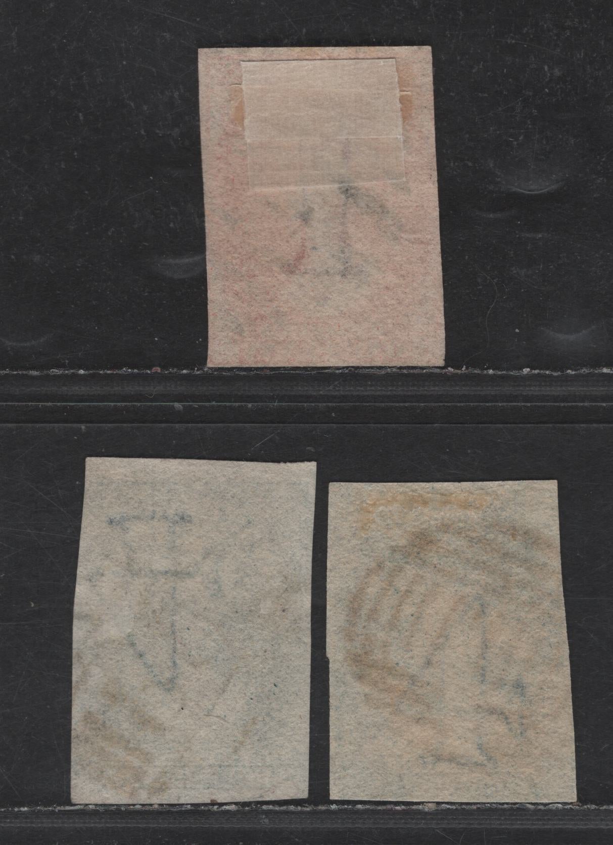 3 good used singles of the 1d - 4d dull vermillion - bright blue Queen Victoria from the 1857-1867 Chalon Heads Issue, double lined 1 & 4 wmks, blue shade's wmk inverted.