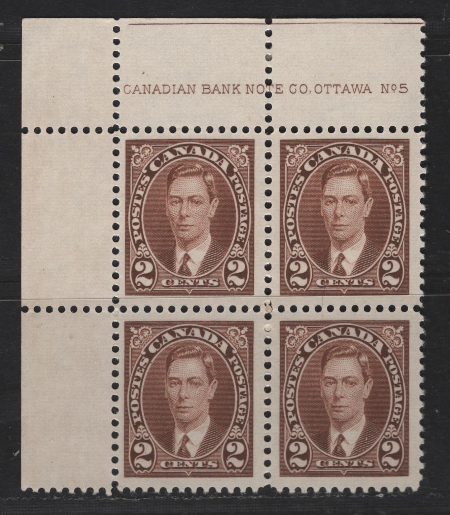 A VFNH UL plate 1 block of 4 of the 2c brown King George VI from the 1937 Mufti Issue, perf 12, hinge in selvedge.