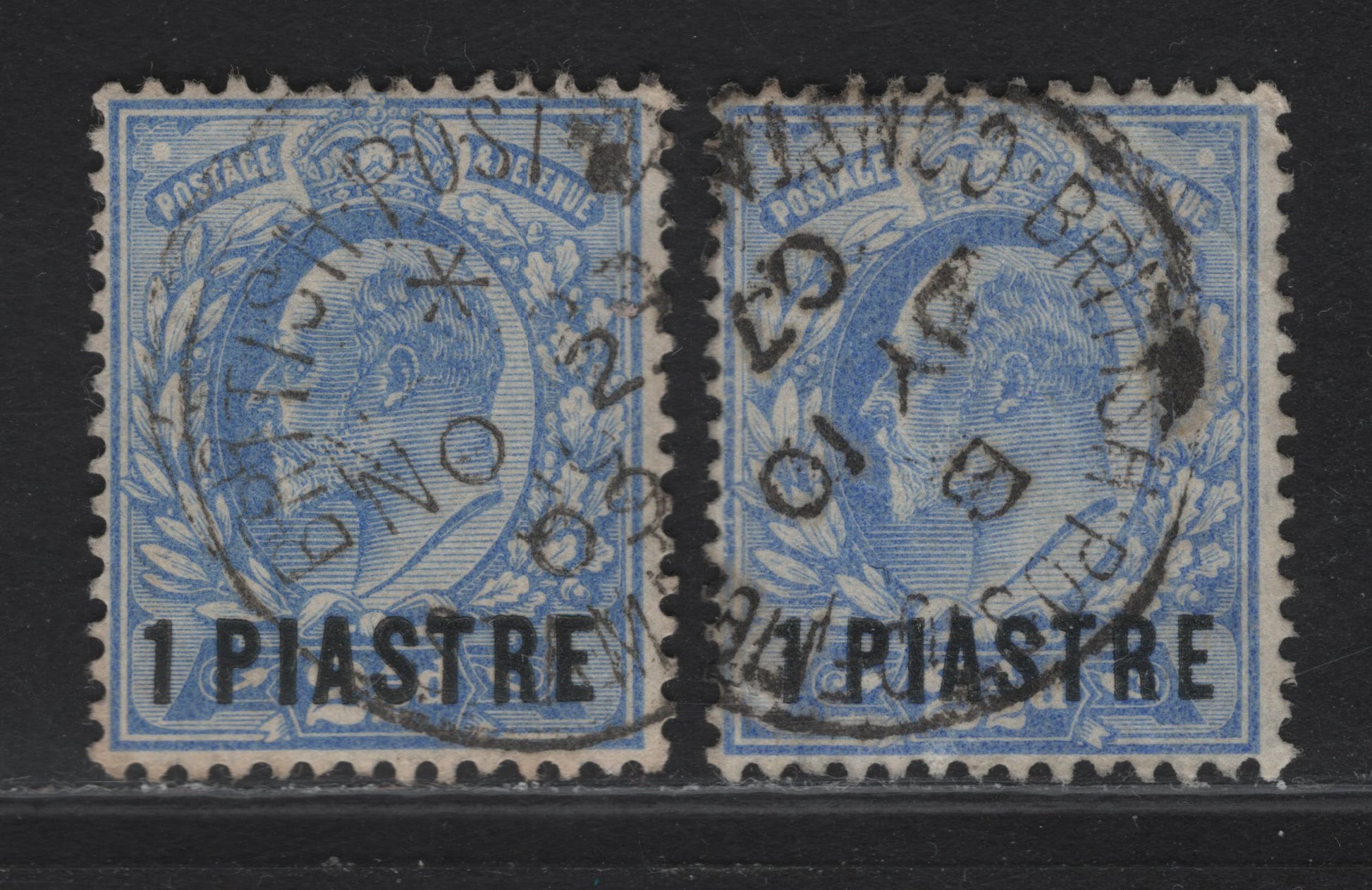 Lot 254 British Levant SG#13var 1pi on 2.5d Ultramarine King Edward VII, 1902-1905 King Edward VII Issue, 2 Fine/Very Fine Used Singles, Wmk Crown, Right Vertical Border Line & Crown & Portion Of Sheet Margin 'Postage' Wmk