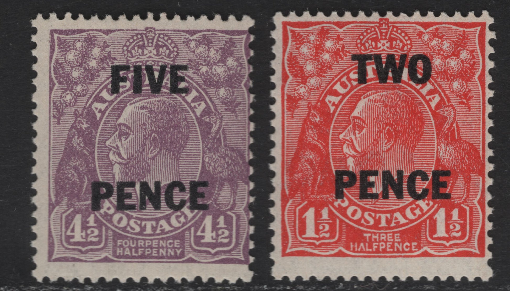 Lot 254 Australia SG#119-120 2d - 5d on 4.5d Golden Scarlet - Violet King George V, 1930 Surcharged KGV Heads Issue, 2 FNH Singles