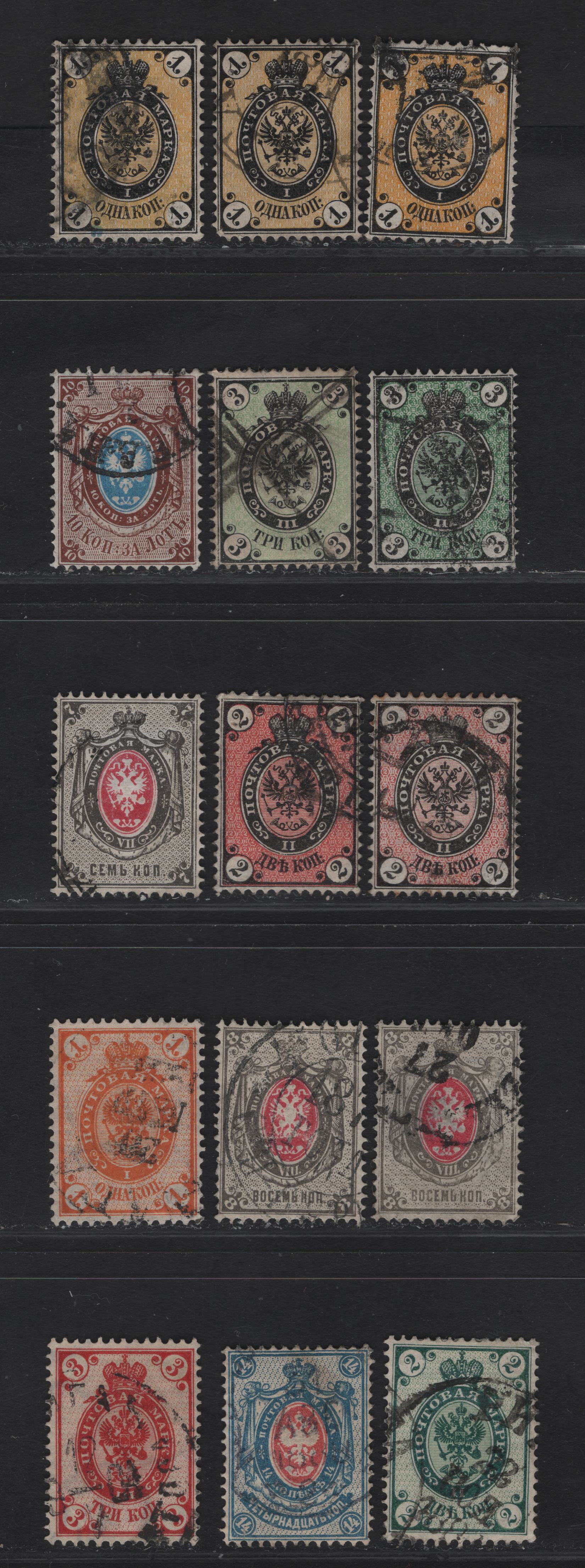 Lot 262 (C) Russia SC#19-a, 20-a, 23, 26, 27a, 28, 31-33, 36 1k - 14k Black & Yellow - Blue & Rose Coat of Arms, 1866-1888 Coat of Arms Issue, 15 Very Fine Used Singles, Horizontally Laid Paper, Various Shades