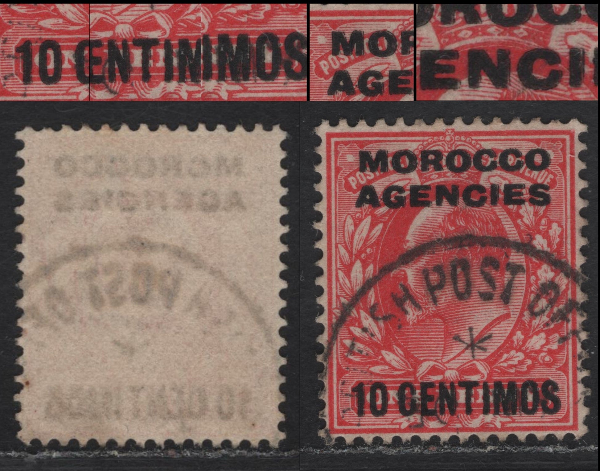 Lot 264 Morocco Agencies SG#113var 10c on 1d Scarlet King Edward VII, 1907-1912 King Edward VII Issue, A Very Fine Used Single, Double Surcharge, Traces Of Doubling On Most All Of The Letters Of The Surcharge, Unlisted.