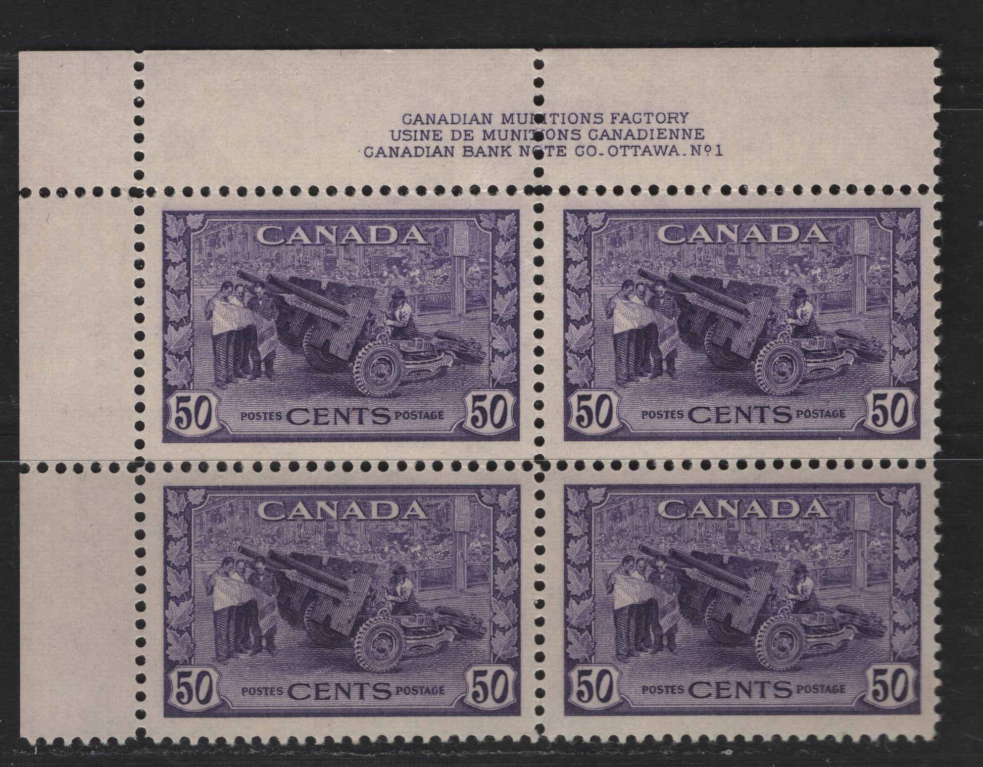 Lot 269 Canada #261 50c Violet Munitions Factory, 1942-1943 War Issue, A VFNH UL Plate 1 Block Of 4, Perf 12
