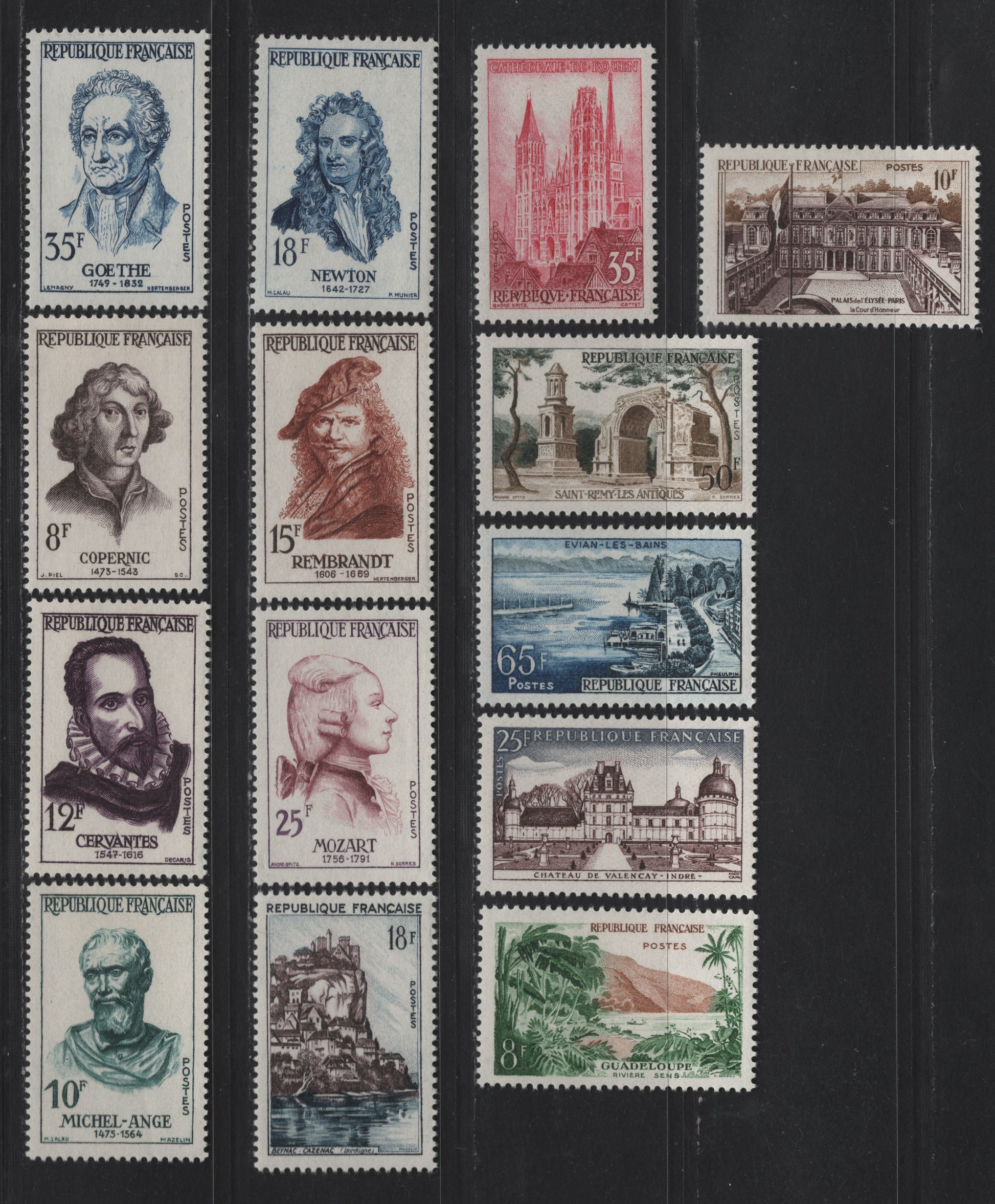 Lot 269 France SC#850-863 8fr - 35fr Green & Light Brown - Blue Sens River, Guadeloupe - Nicolaus Copernicus, 1957 Scenic Views - Portraits Issues, 14 VFOG Singles, DF, LF & Fluorescent Papers
