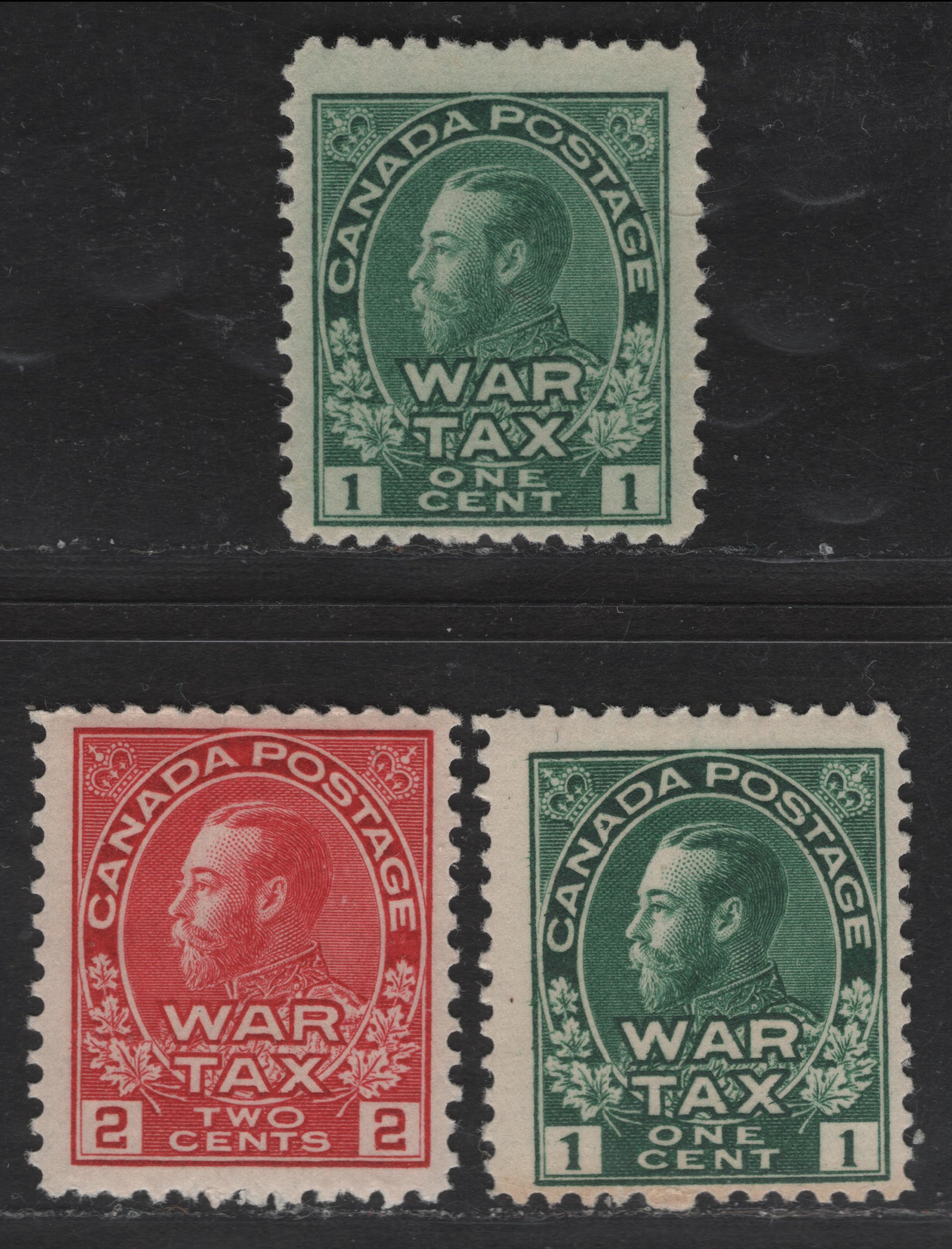 Lot 27 (C) Canada #MR1-MR2 1c -2c Dark Green, Dull Bluish Green & Rose Carmine King George V, 1915 War Tax Issue, 3 FNH Singles, Retouched Framelines.