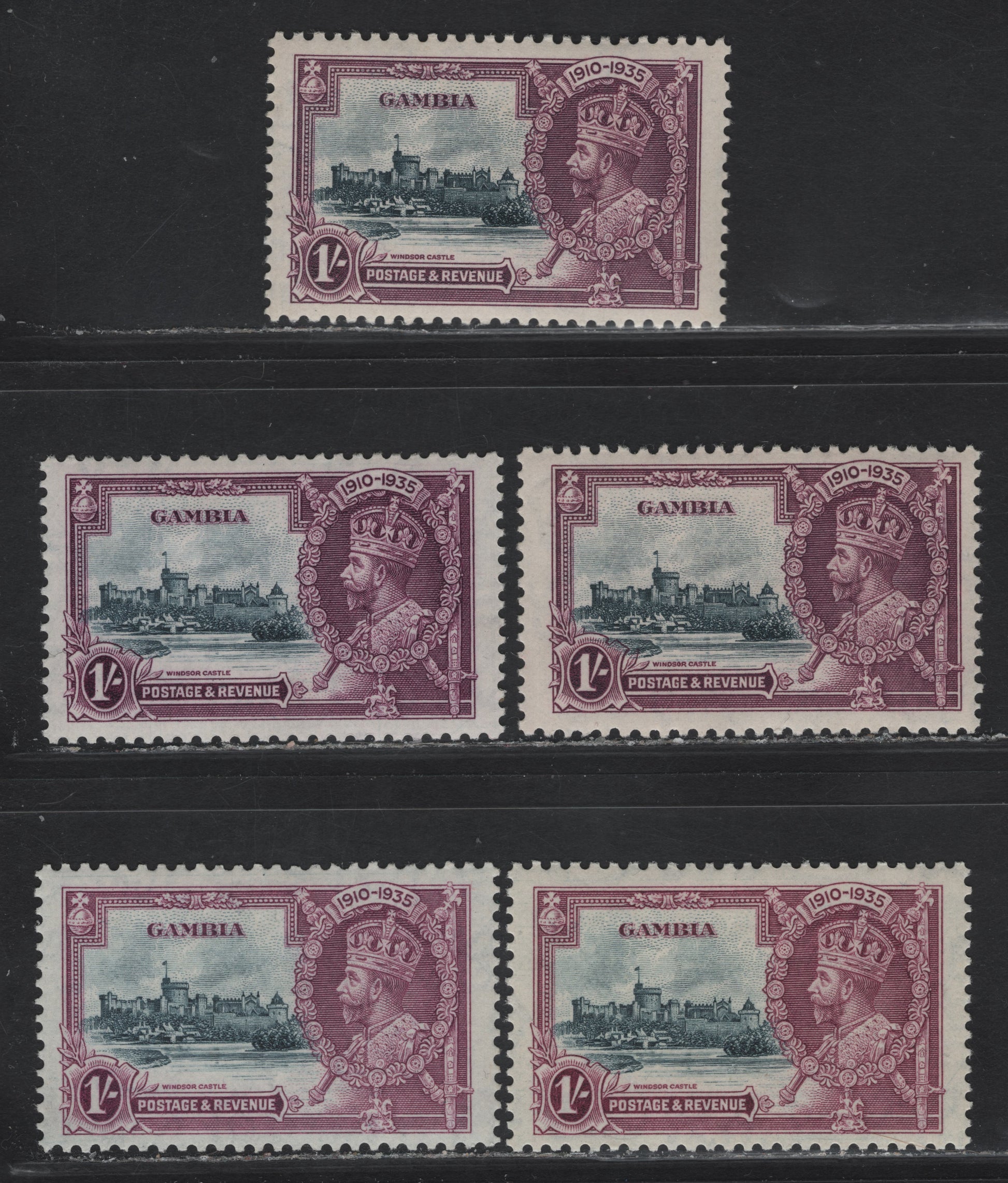 Lot 270 Gambia SG#146 1/- Slate & Purple/Light Purple KGV & Windsor Castle, 1935 Silver Jubilee Issue, 5 F/VFOG Singles, Shade Low Showing Subtle Variations In Frame & Vignette Plate Shades
