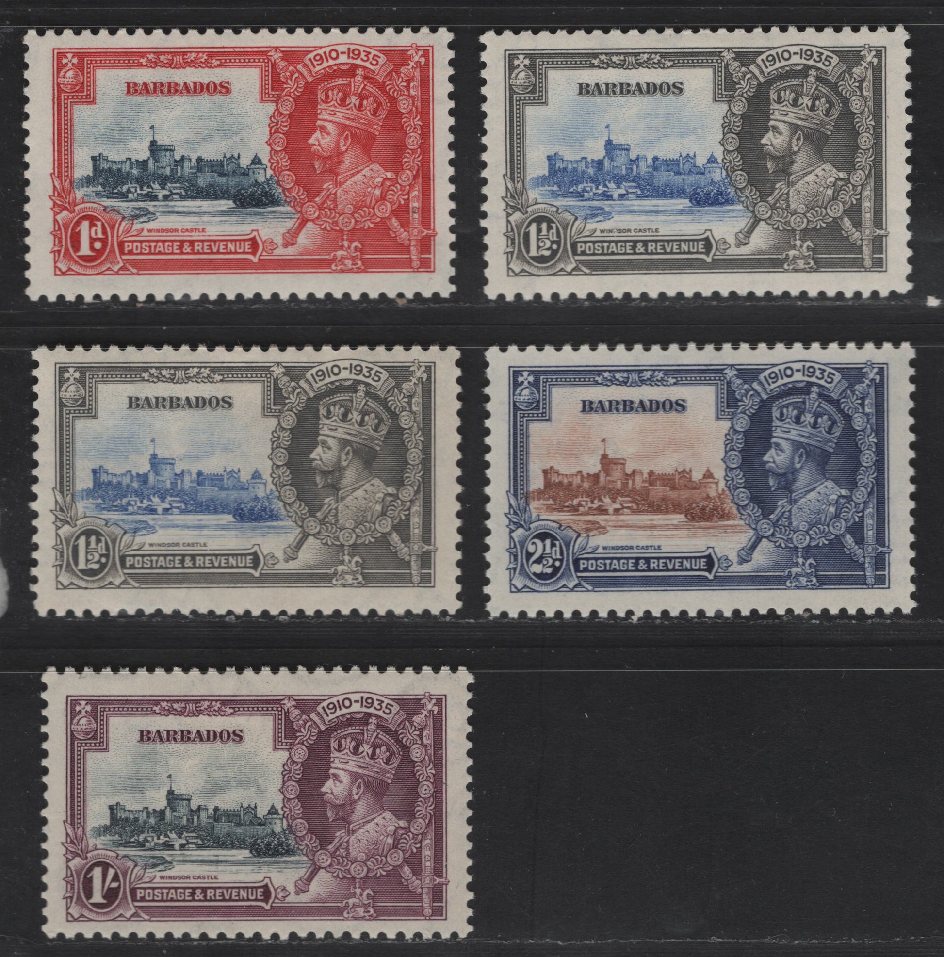 Lot 272 Barbados SC#186-189 1d - 1/- Carmine & Dark Blue - Brown Violet & Indigo King George V & Castle, 1935 Silver Jubilee Issue, 5 VFOG Singles, Two Similar Vignette Shades Of Ultramarine On The Vignette, One Bright Than The Other