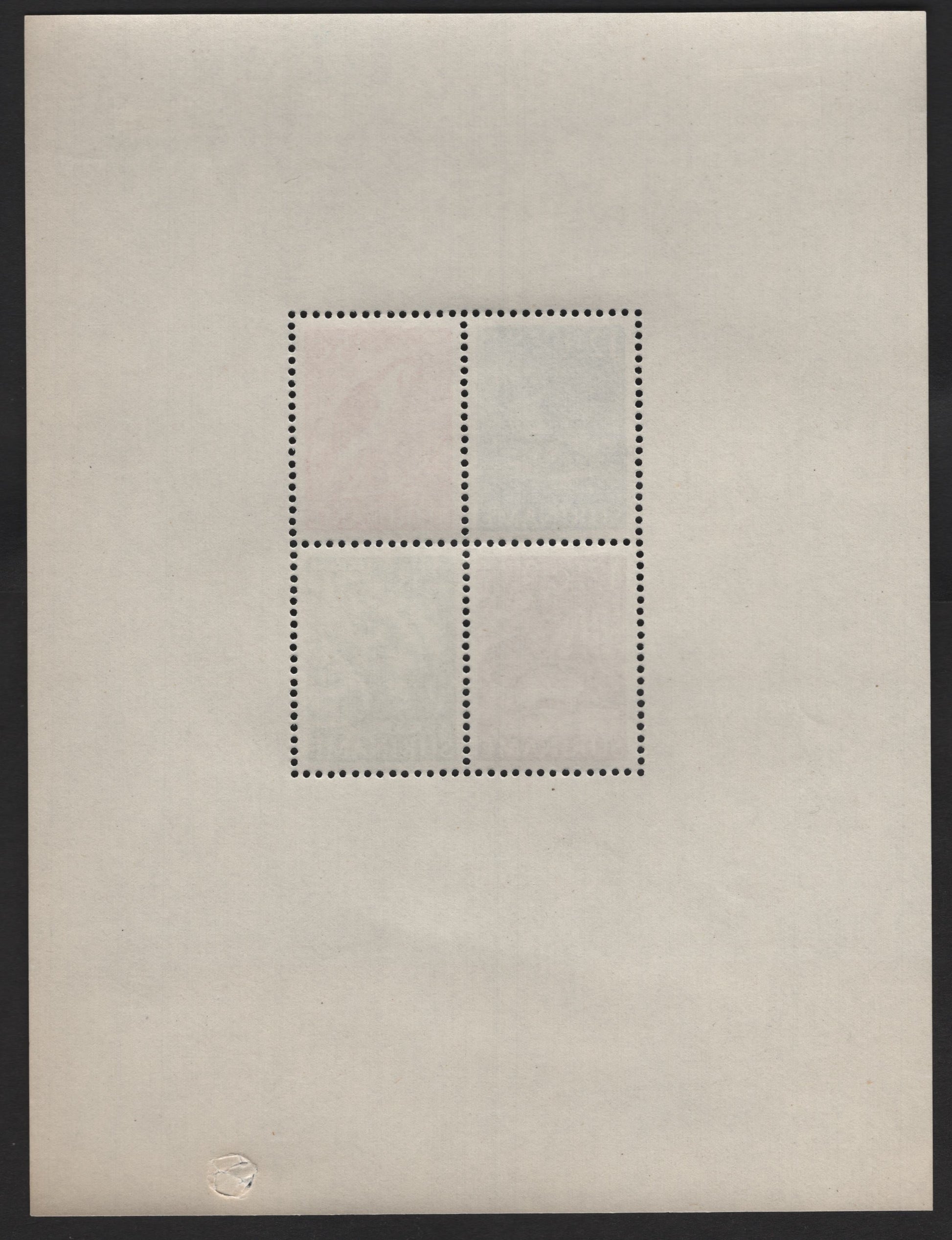 A VFNH miniature sheet of 4 of the 12.5c - 25c dark gray blue - olive green Armored Catfish - Iguana from the 1953-1955 Pictorial Issue, stamps are well centered, but sheet has a hole in the selvedge.