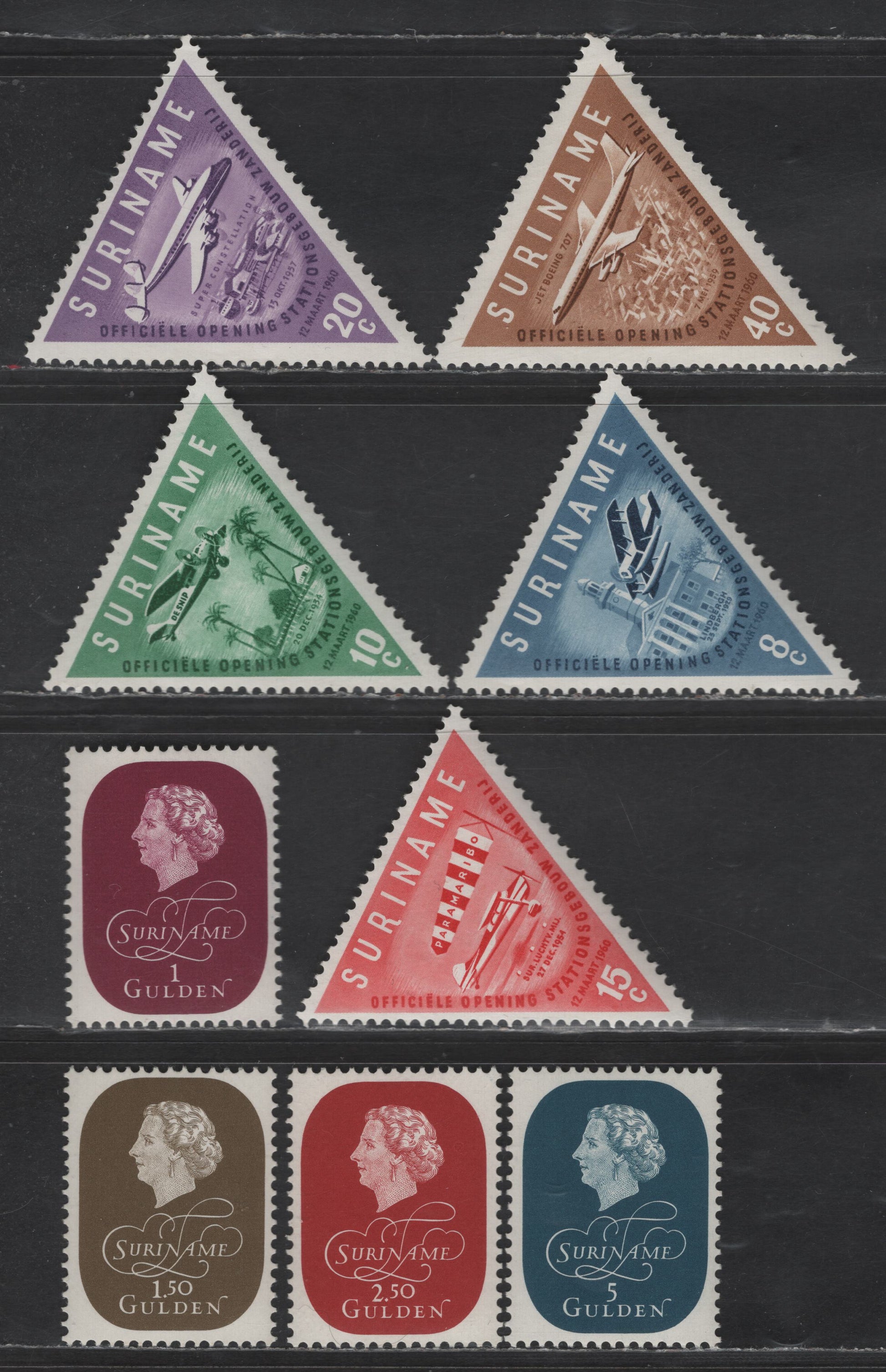 9 F/VFNH/OG singles of the 1g - 40c magenta - light brown Queen Juliana - Zanderij Airport from the 1959-1960 Queen Juliana - Inauguration of Zanderij Airport Issues, queen juliana set is nh.