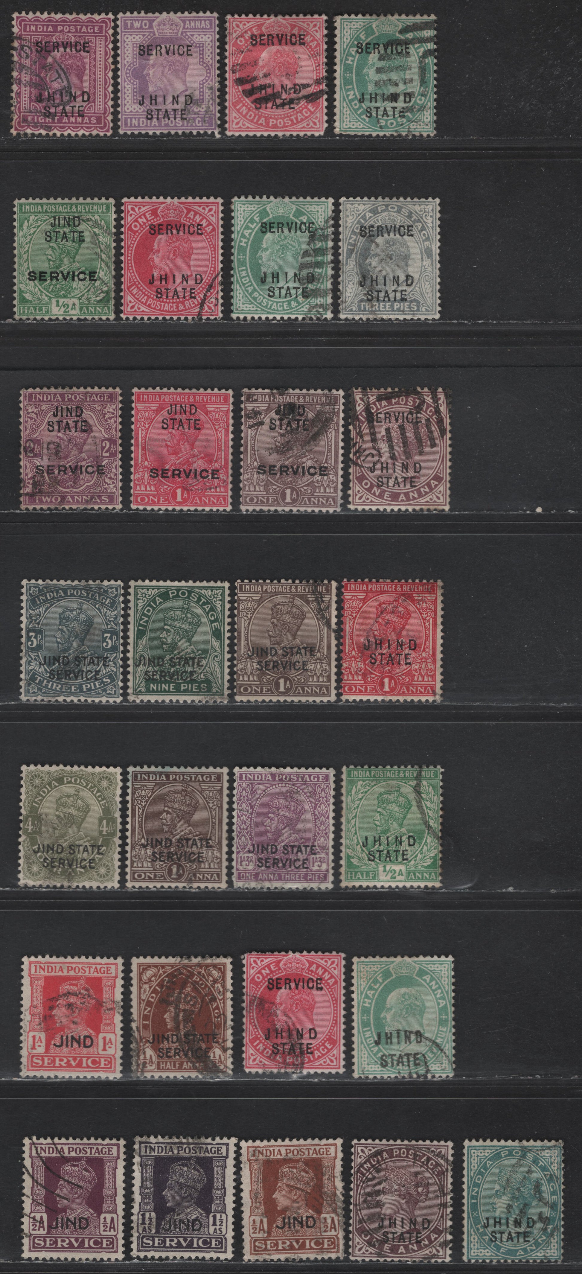 Lot 279 India - Jind SG#17/60, O14/O78 1/2a - 1.5a Blue Green -Dark Gray Queen Victoria - KGVI, 1886-1944 Queen Victoria - KGVI Service Designs Issue, 29 Fine/Very Fine Used Singles
