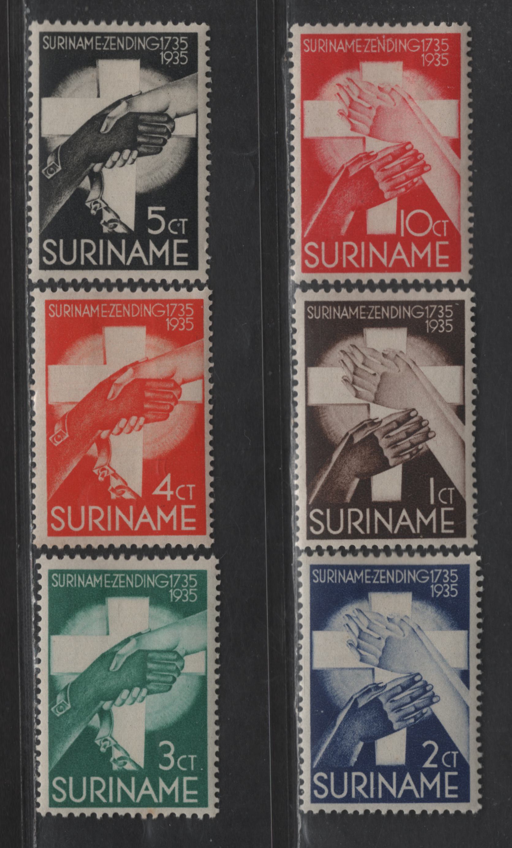 Lot 280 Suriname SC#B16-B21 1c+1/2c - 10c+5c Dark Brown - Carmine Creed of the Moravians, 1935 200th Anniv of the Founding of the Moravian Mission Semi Postal Issue, 6 VFOG Singles