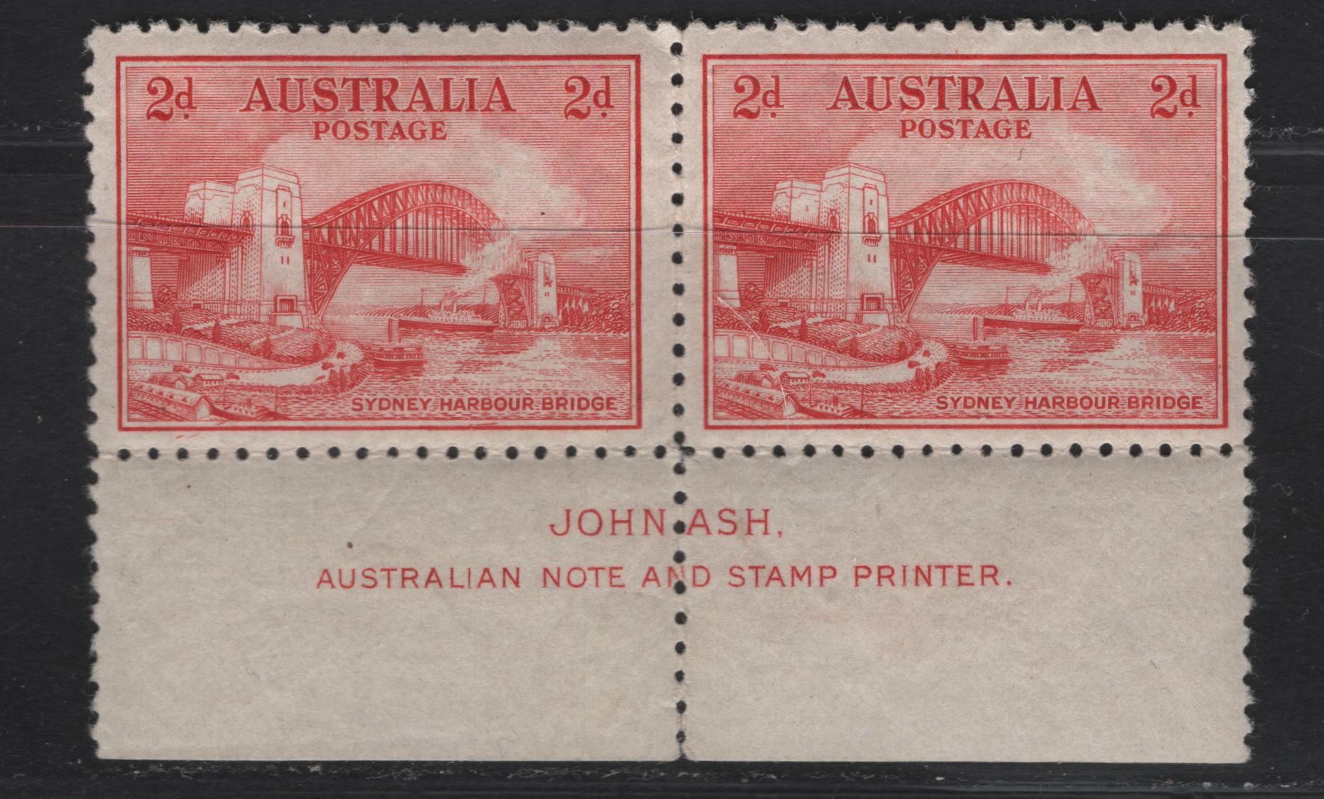 A VFNH pair of the 2d scarlet Sydney Harbor Bridge from the 1932 Opening Sydney Harbor Bridge Issue, ash imprint pair.