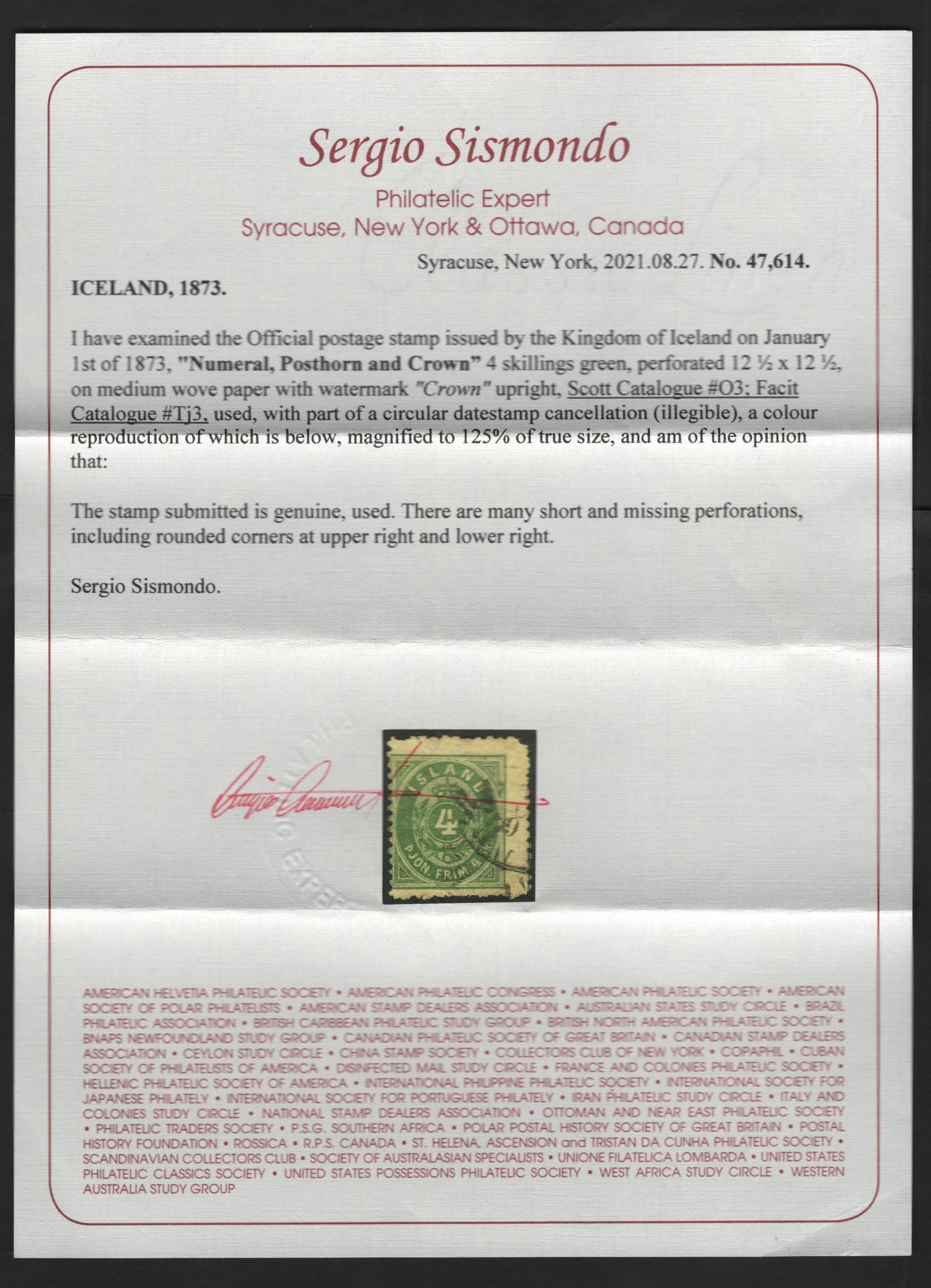 Lot 29 Iceland #O3 4s Green Numeral, 1873 Official Issue, A Fair Used Single, Sismundo Certificate, Stating Many Short & Missing Perfs, A Rare Stamp Used In Any Condition.