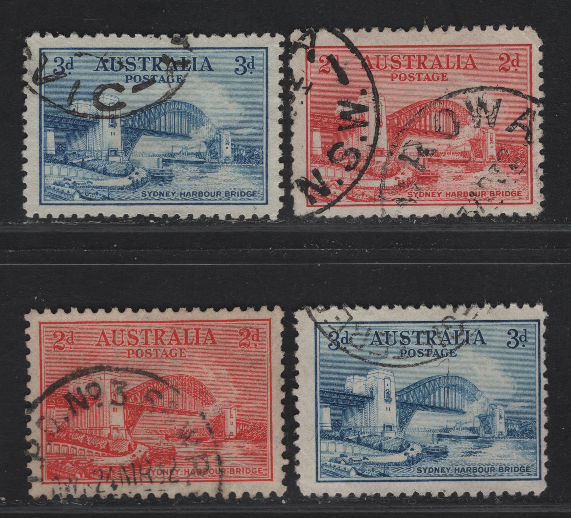 2 fine/very fine used singles of the 2d - 3d scarlet - blue Sydney Harbor Bridge from the 1932 Opening Sydney Harbor Bridge Issue, engraved & typographed stamps, two shades of 3d, one on vertical wove & one on horizontal wove.
