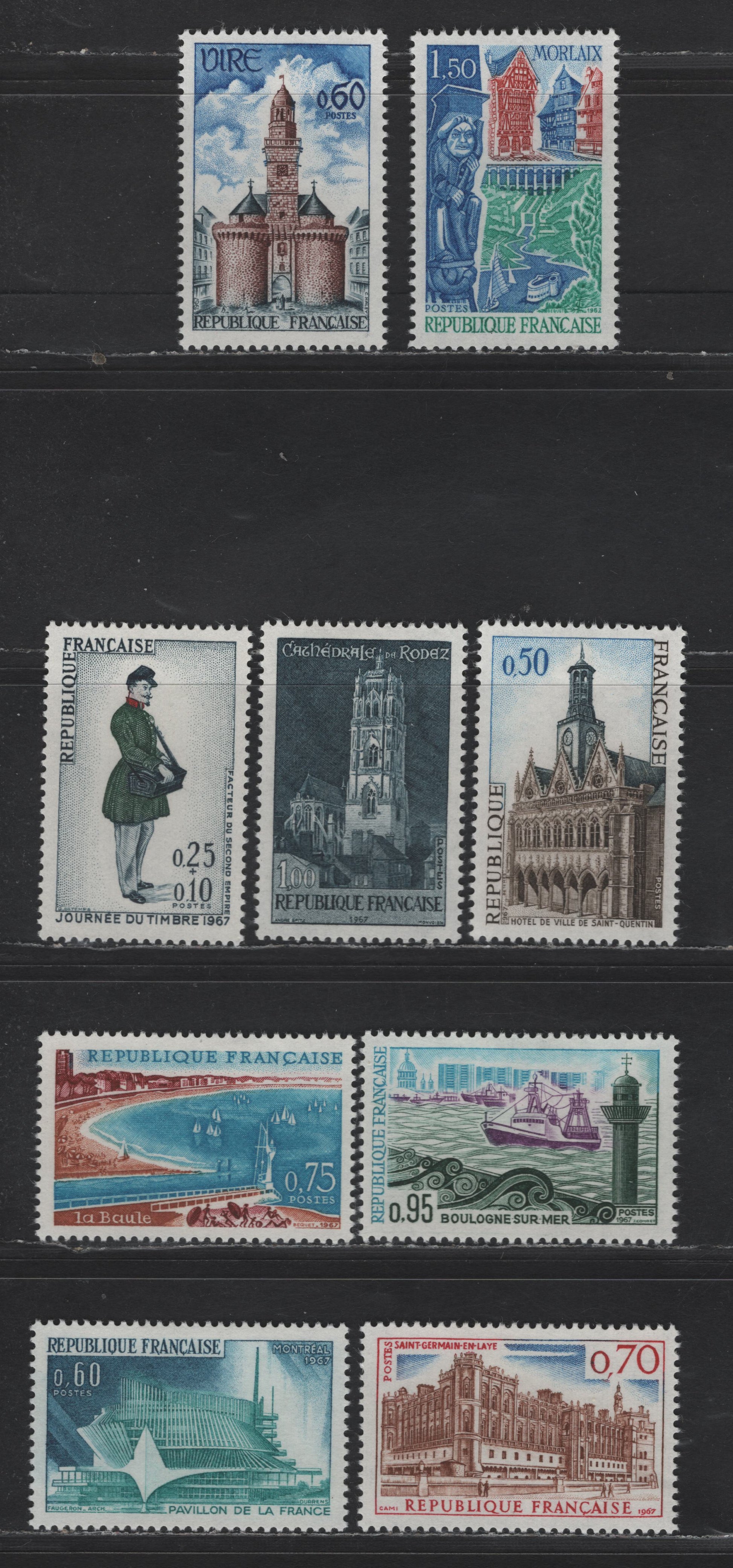 Lot 296 France SC#1185-1191, B408 50c - 25c+10c Blue, Slate Blue & Brown - Indigo, Green & Red City Hall - Letter Carrier, 1967 Views & Semi Postal Issues, 9 VFOG Singles, HF & HB Papers