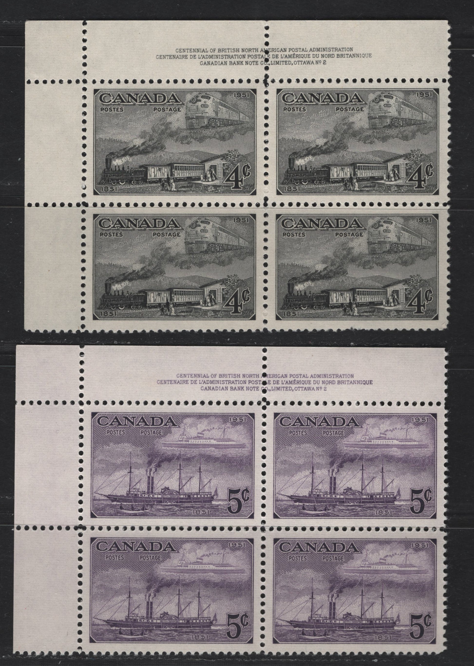 Lot 299 Canada #311-312 4c - 5c Dark Gray - Purple Trains - Steamships, 1951 Stamp Centenary Issue, 2 VFNH UL Plate 2 Blocks Of 4, Light Crease On 4c Block, Perf 12