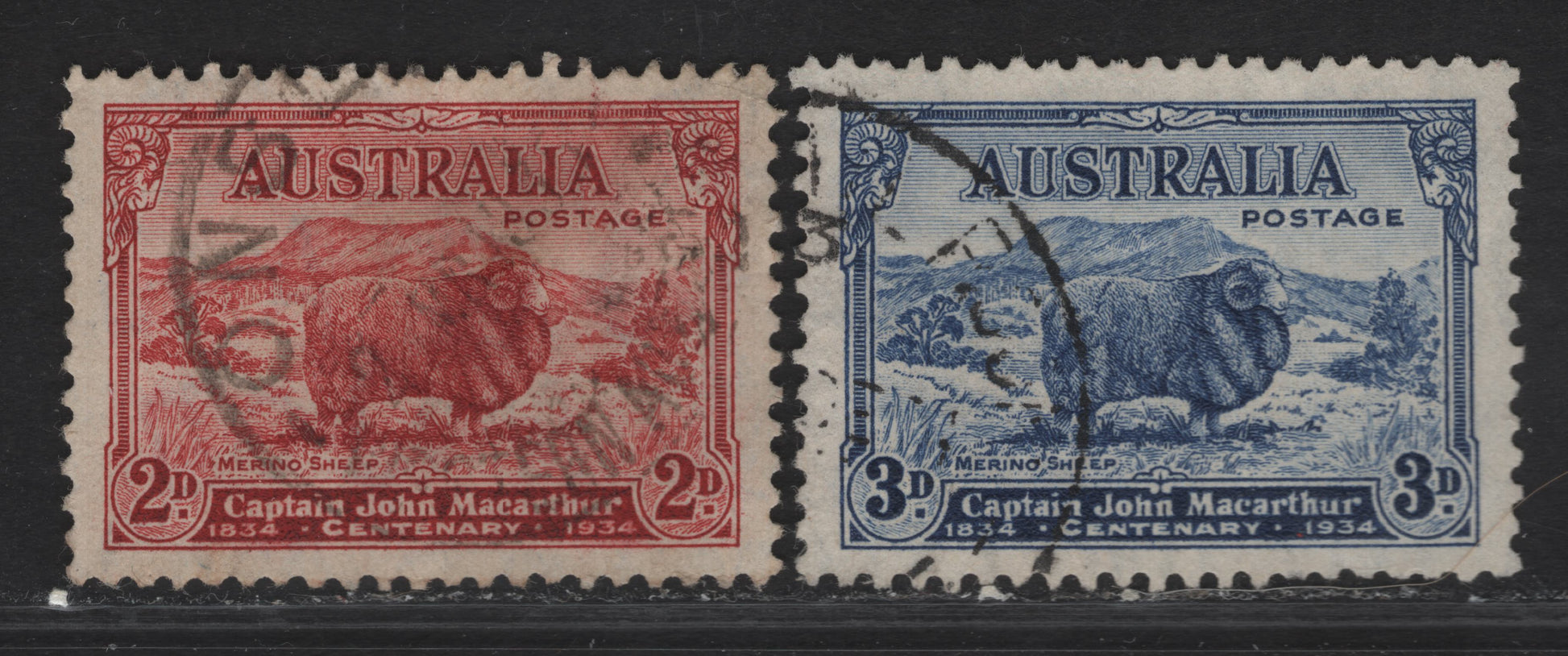 Lot 300 (C) Australia SG#150-151 2d - 3d Carmine Red - Blue Merino Ram, 1934 Macarthur Issue, 2 Very Fine Used Singles, 2d Carmine Red Die A
