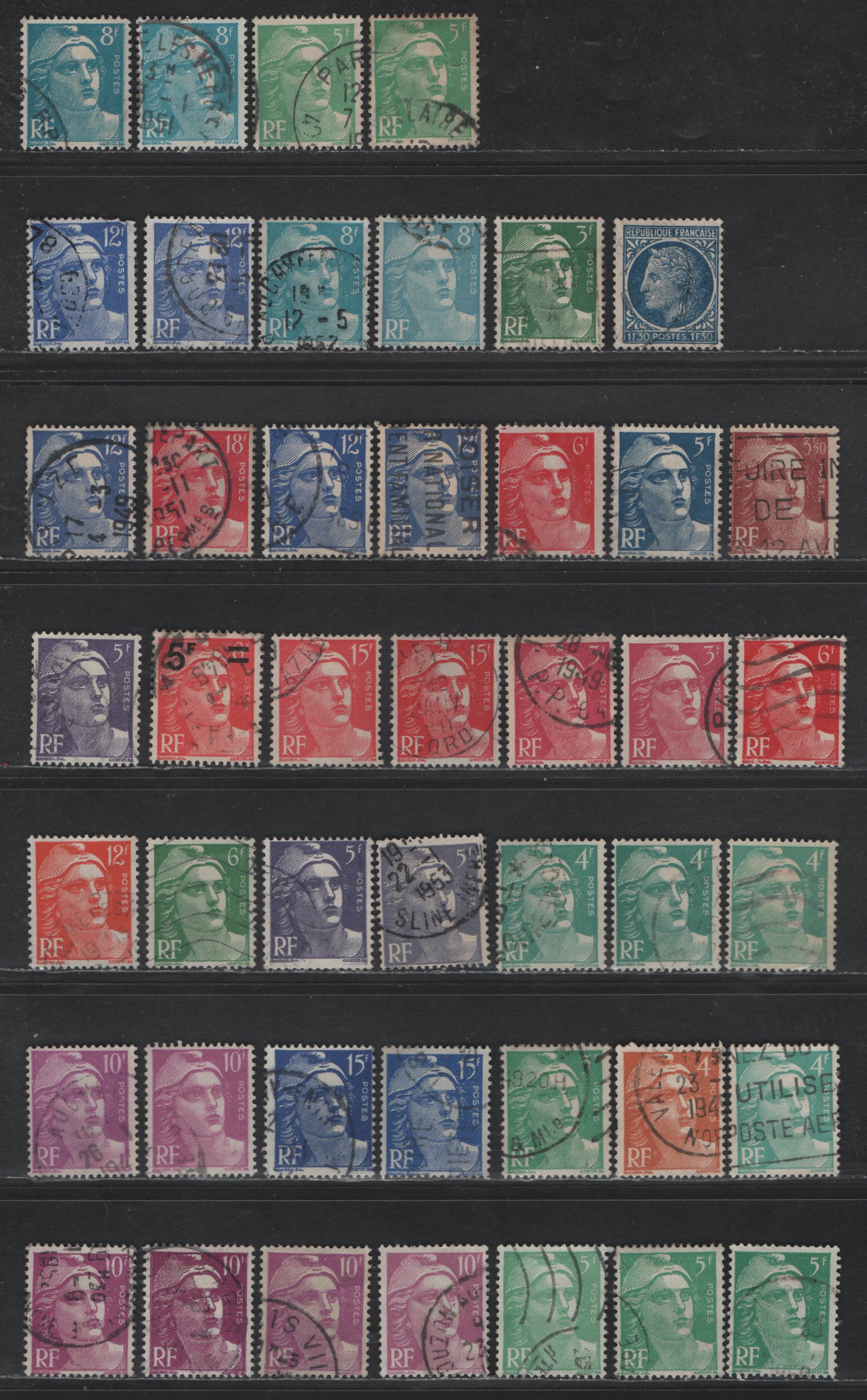 Lot 300 France #576-580, 595-602, 650-654, 610 1.3fr Dull Blue - 18fr Cerise,1945-1949 Mariame Definitives Issue, 45 F & VF Used Singles With Numerous Shades