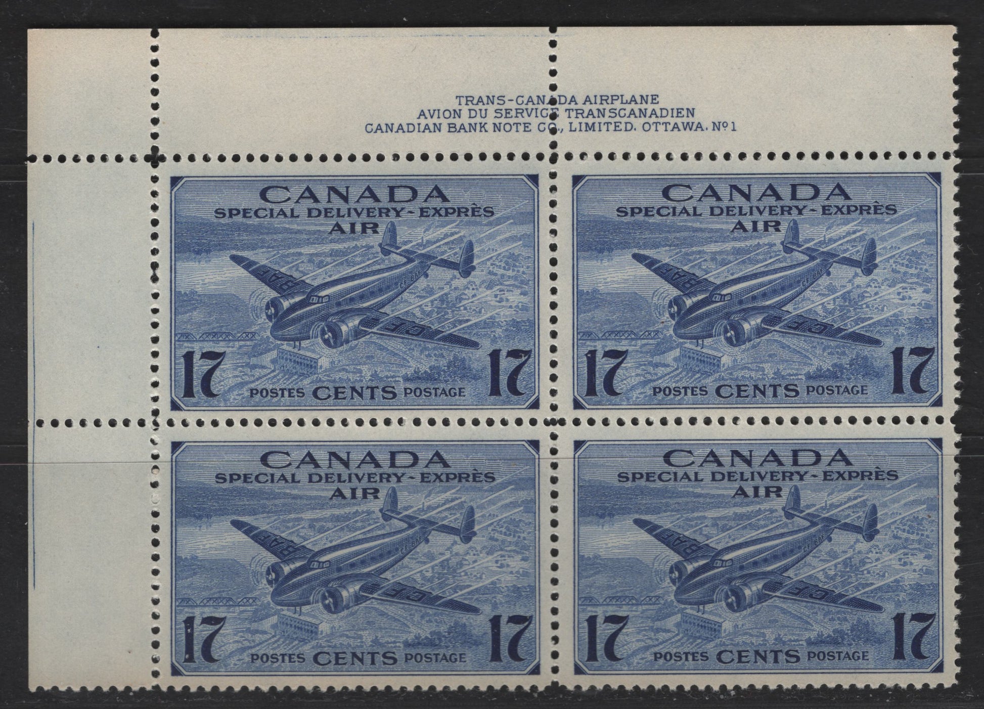 A VFNH UL plate 1 block of 4 of the 17c bright ultramarine Trans-Canada Airplane from the 1942-2943 Airmail Special Delivery Issue, perf 12.