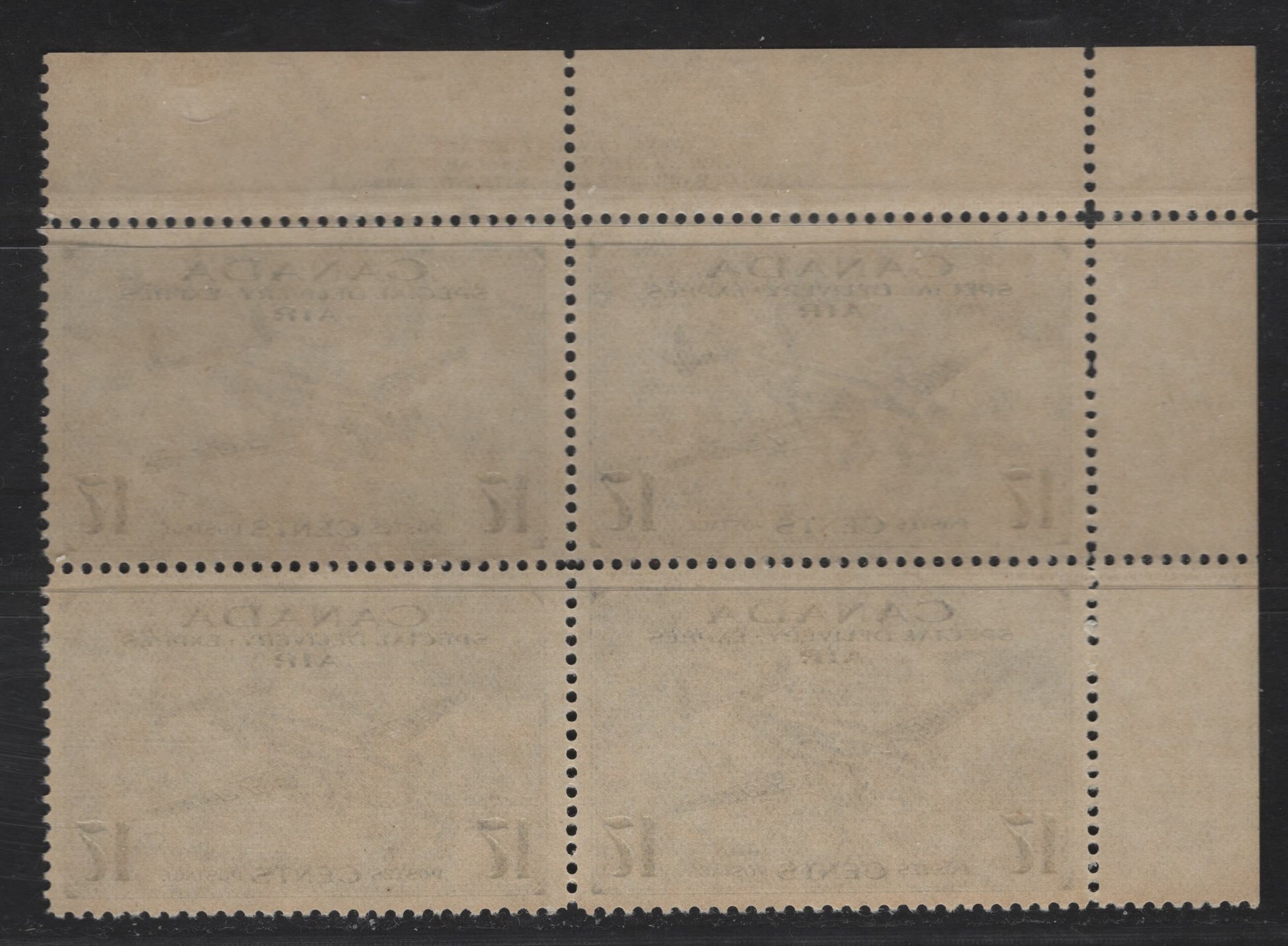 Lot 303 Canada #CE2 17c Bright Ultramarine Trans-Canada Airplane, 1942-2943 Airmail Special Delivery Issue, A VFNH UL Plate 1 Block Of 4, Perf 12