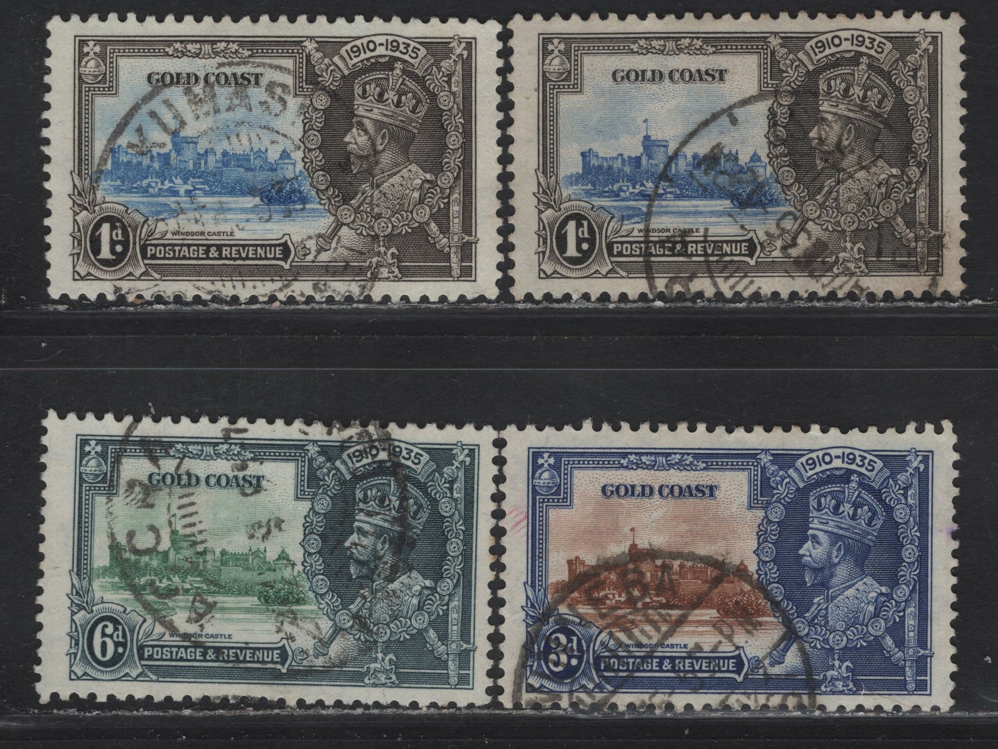 Lot 305 Gold Coast SG#113-115 1d - 6d Ultramarine & Gray - Green & Indigo KGV & Windsor Castle, 1935 Silver Jubilee Issue, 4 Fine/Very Fine Used Singles, Scarce Postally Used 3d & 6d, 2 Shades of Blue On 1d