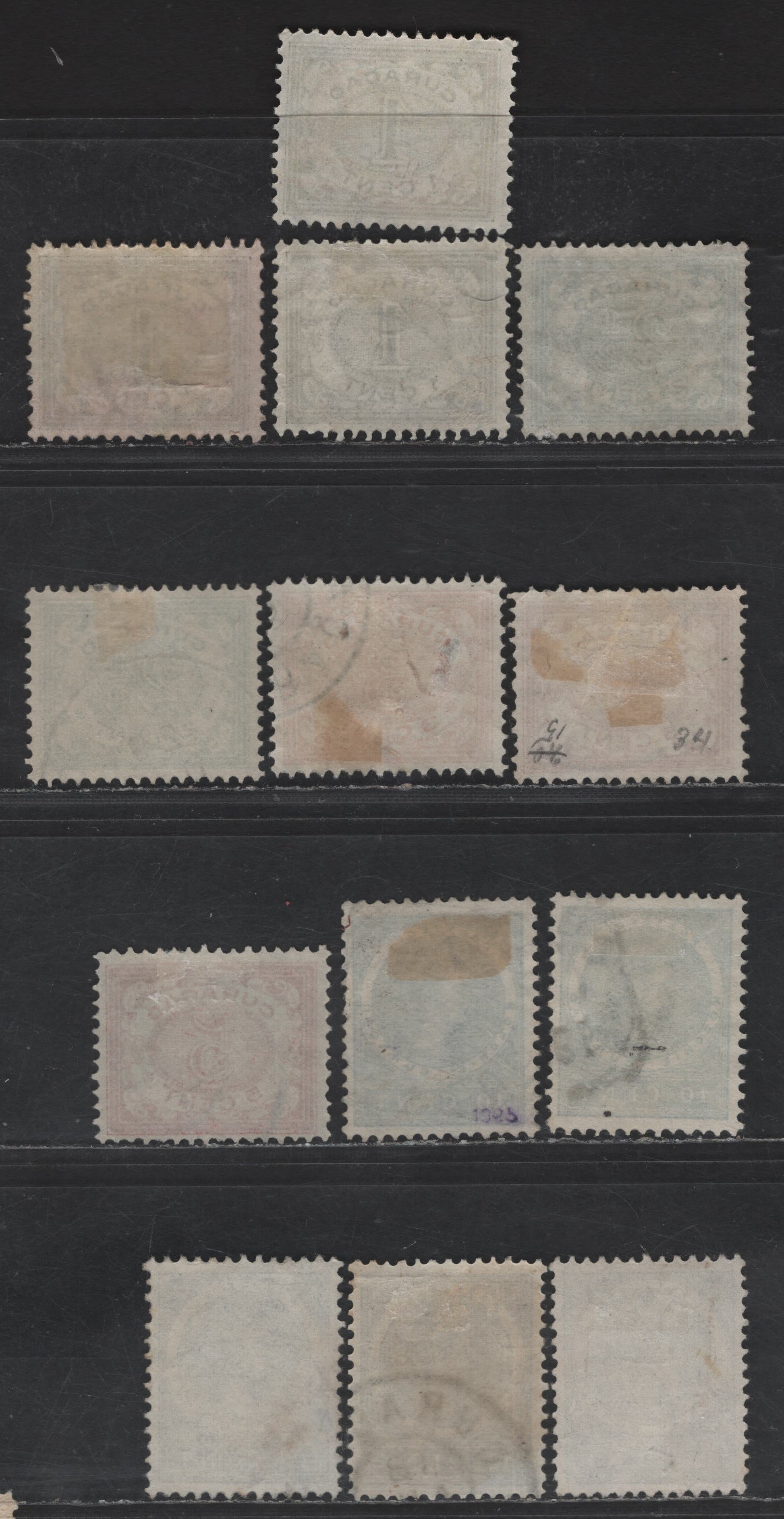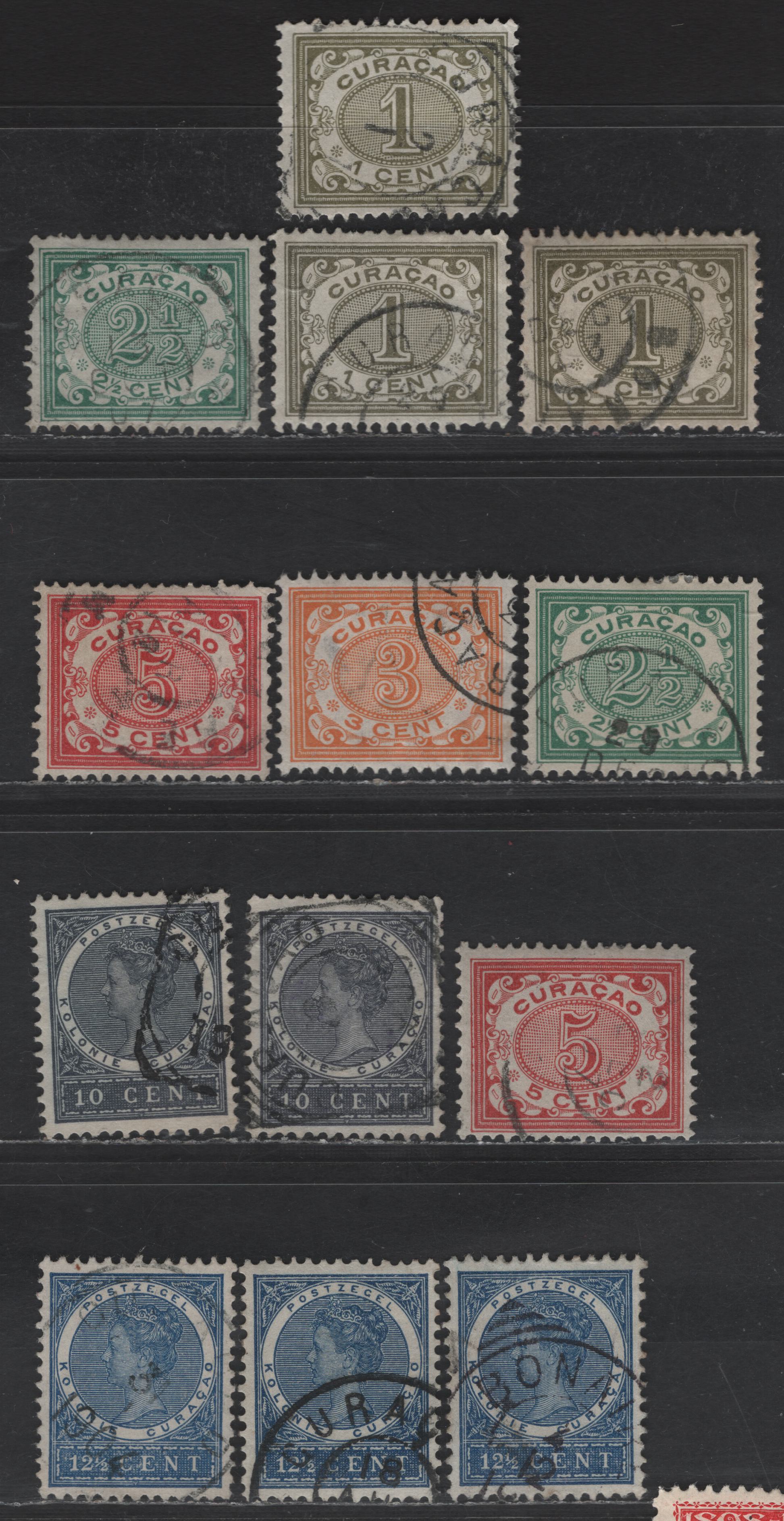 Lot 307 Netherlands Antilles SC#30, 32-34, 36-37 1c - 12.5 Olive Green - Deep Blue Numeral - Queen Wilhelmina, 1904-1908 Numeral & Queen Wilhelmina Issues, 13 VFOG Singles, Cross Hatched Background, Unlisted Shade Variations