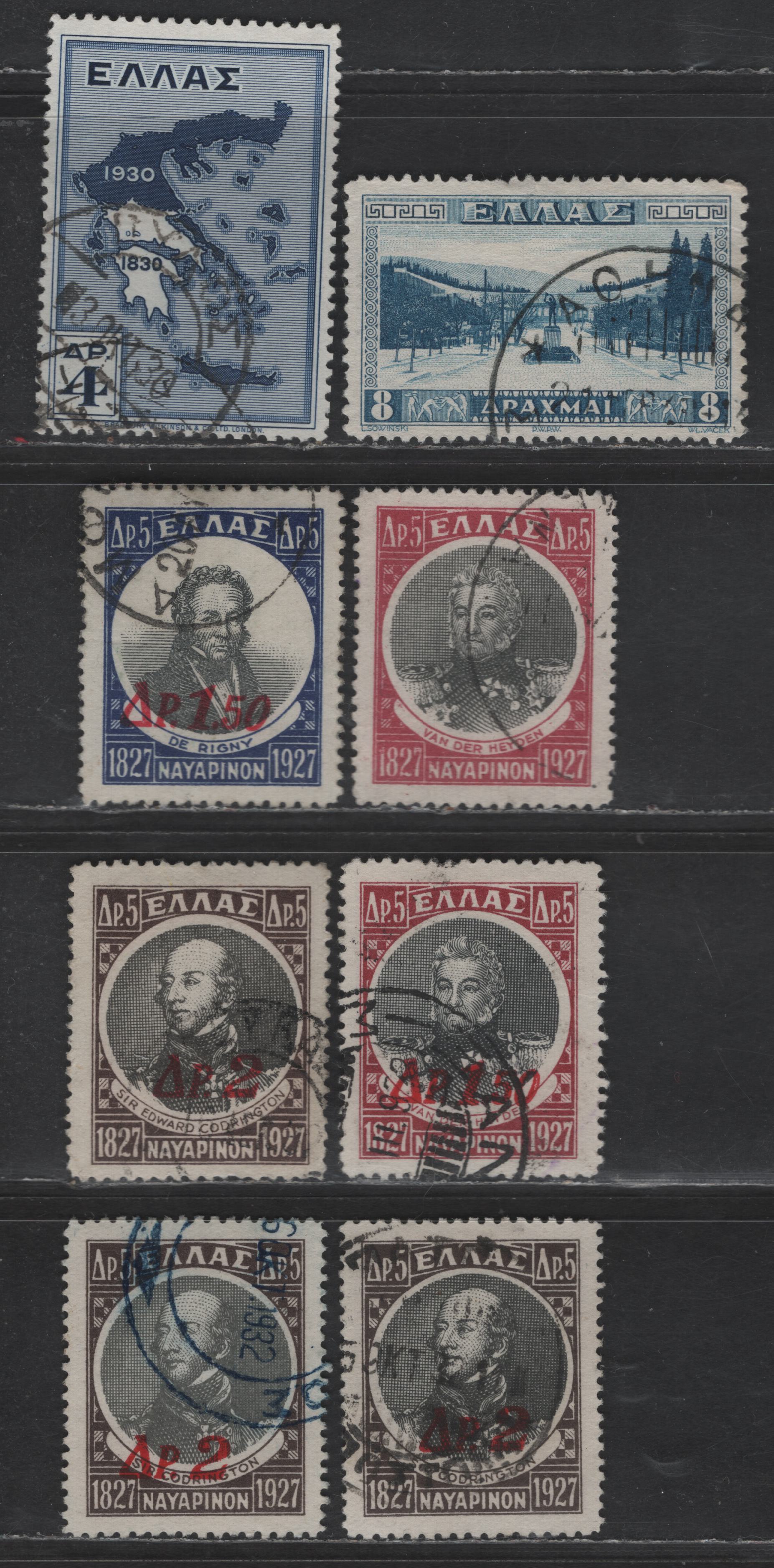 Lot 322 Greece #343, 359, 372-375, 381 5d Lake & Black - 2d Grey & Dark Brown, 1927-1928 Battle Of Naverino - 1932 Surcharges Issues, 8 Very Fine Used Singles