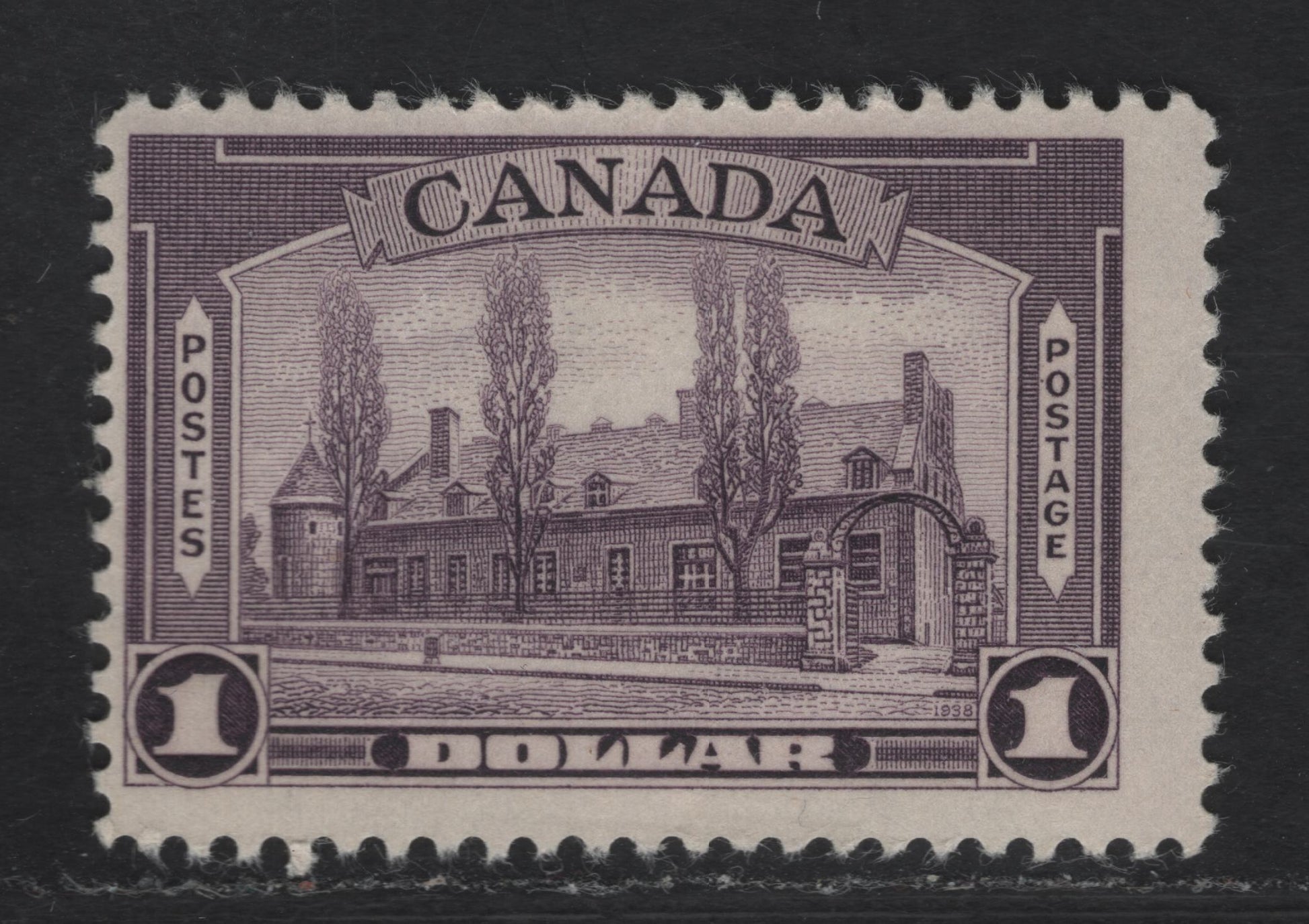 A FOG single of the $1 dull violet Chateau De Ramezay from the $1938 Pictorial Issue gum type CBN-N, with perf 11.9x12, printed in non-analine ink. This is unusual as this paper is normally found on the aniline printings. No hinge, but small internal wrinkle and small amount of gum loss