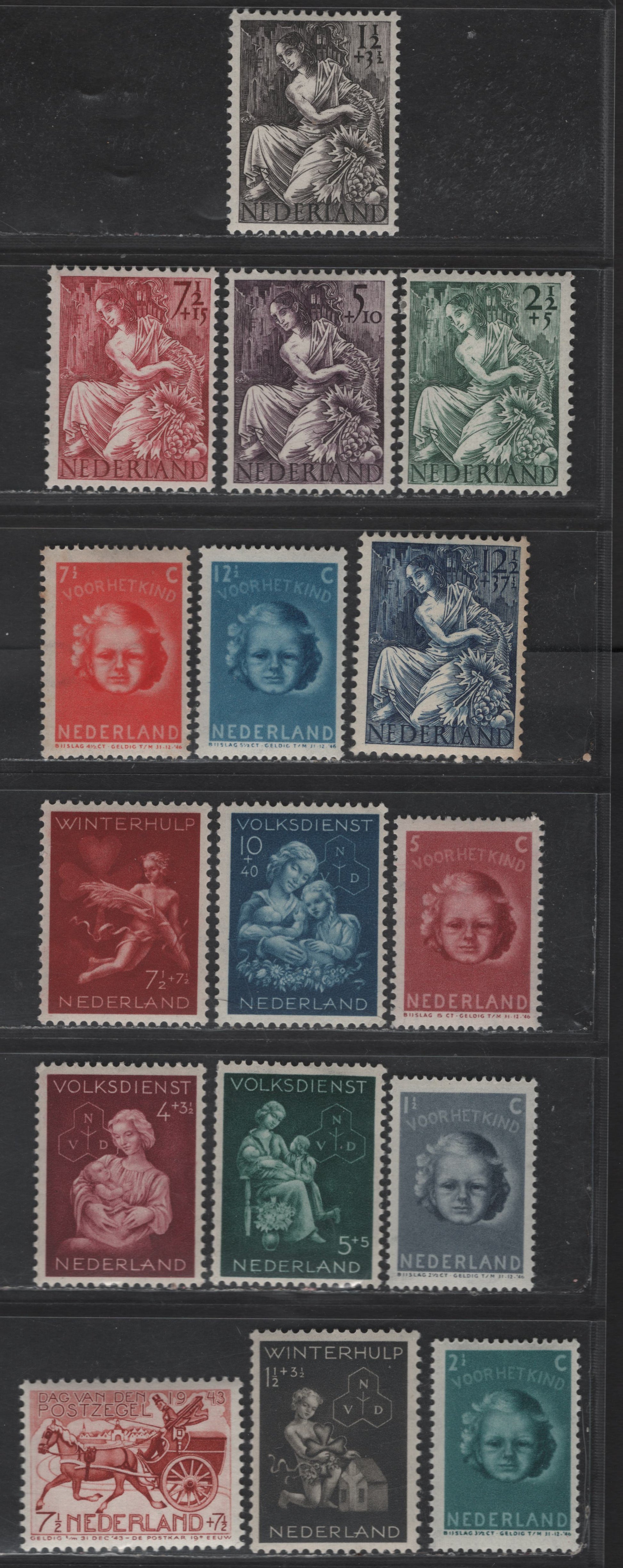 Lot 324 Netherlands SC#B148-B163 7.5c+7.5c - 12.5c+37.5c Henna Brown - Dark Blue 19th Centuary Mail Cart - Fortuna, 1943-1946 Semi Postal Issues, 16 VFNH/OG Singles
