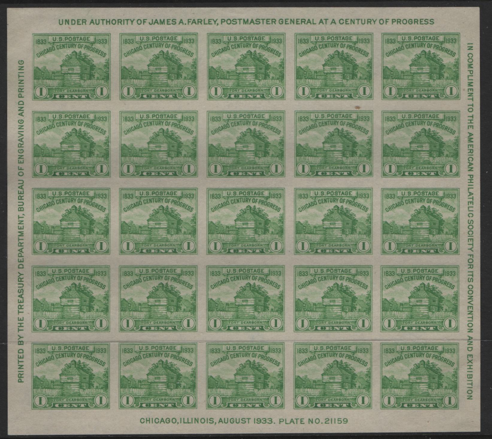 Lot 105 United States Of America #730 1c Yellow Green Restoration Of Fort Dearborn, 1933 American Philatelic Society Issue, A GEM Unused Souvenir Sheet Of 25 Without Gum, As Issued, Plate #21159