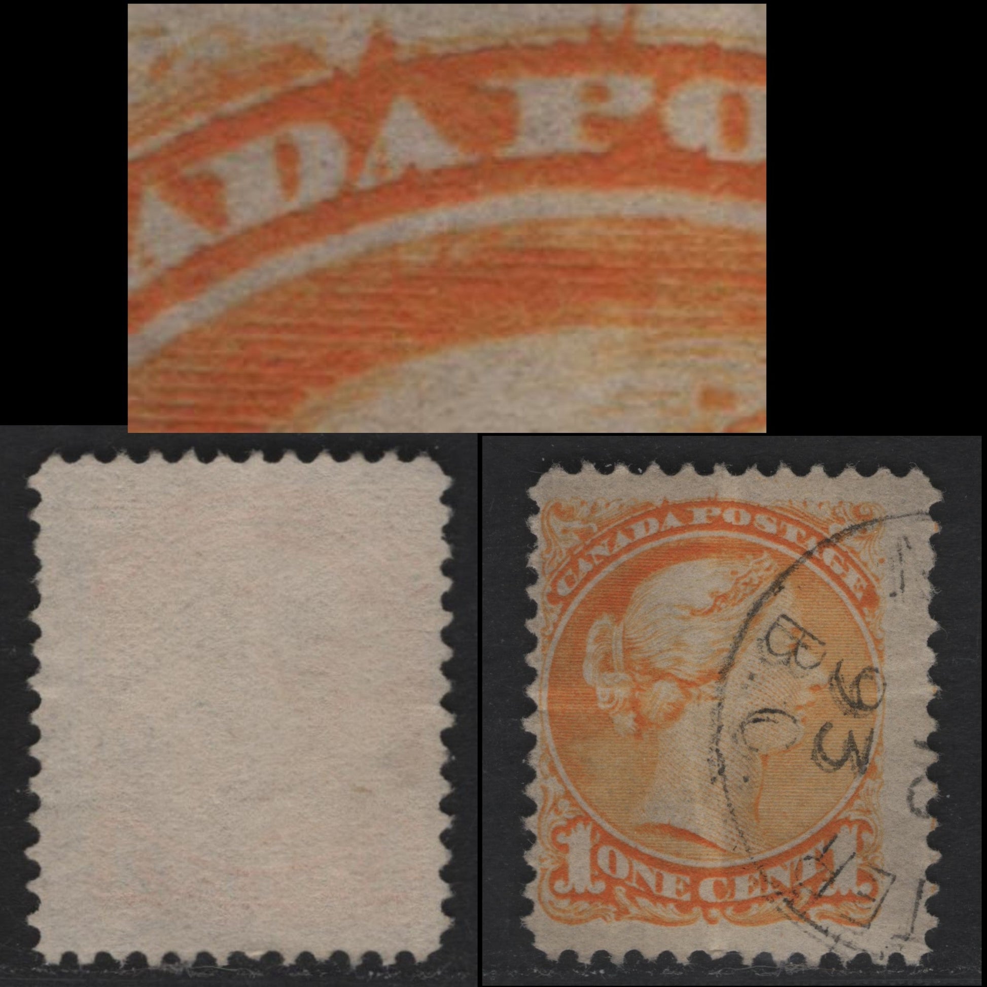 A fine used single of the 1c orange Queen Victoria from the 1870-1897 Small Queen Issue early second Ottawa printing, thin, soft, porous white newsprint with horizontal mesh (2o-a), perf. 12, spur above last "a" of "canada". Flaws like this are much less common on these stamps that you would expect. The dozen or so lots offered in this sale with printing flaws came from several hundred used 1c stamps that I went through thoroughly.