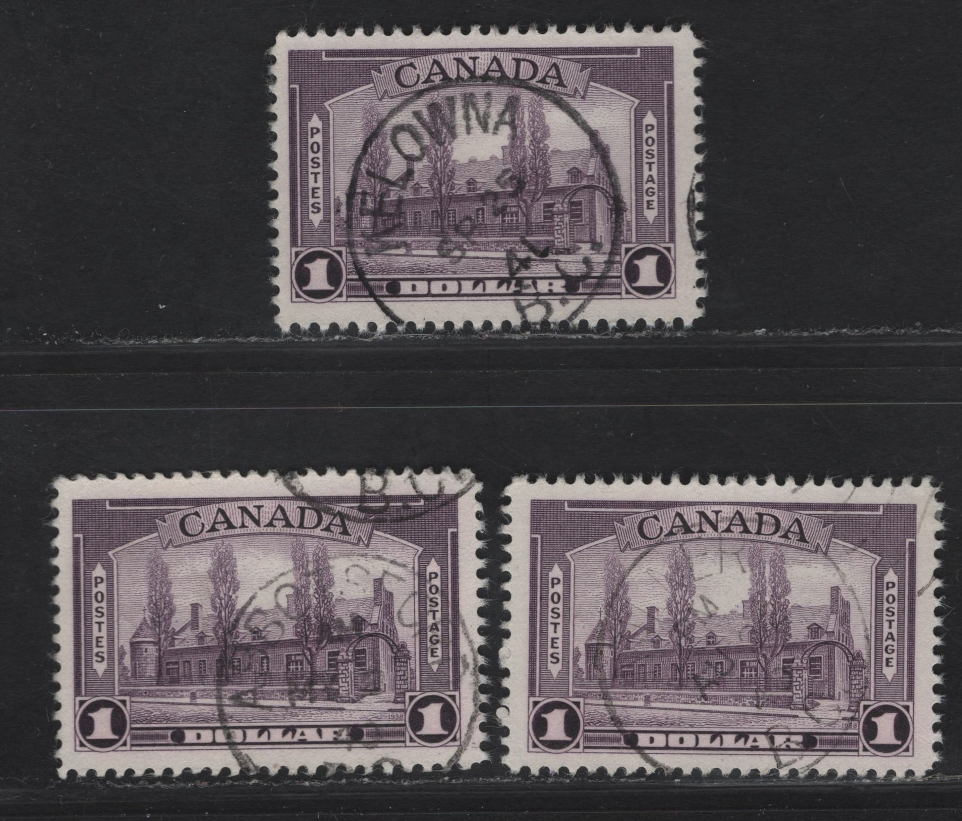 Lot 338 (C) Canada #245i $1 Deep Reddish Aniline Violet Chateau De Ramezay, 1938 Pictorial Issue, 3 F & VF Used Singles On Paper Type CBN-L, Perf 11.9x12,11.9, 12x11.9
