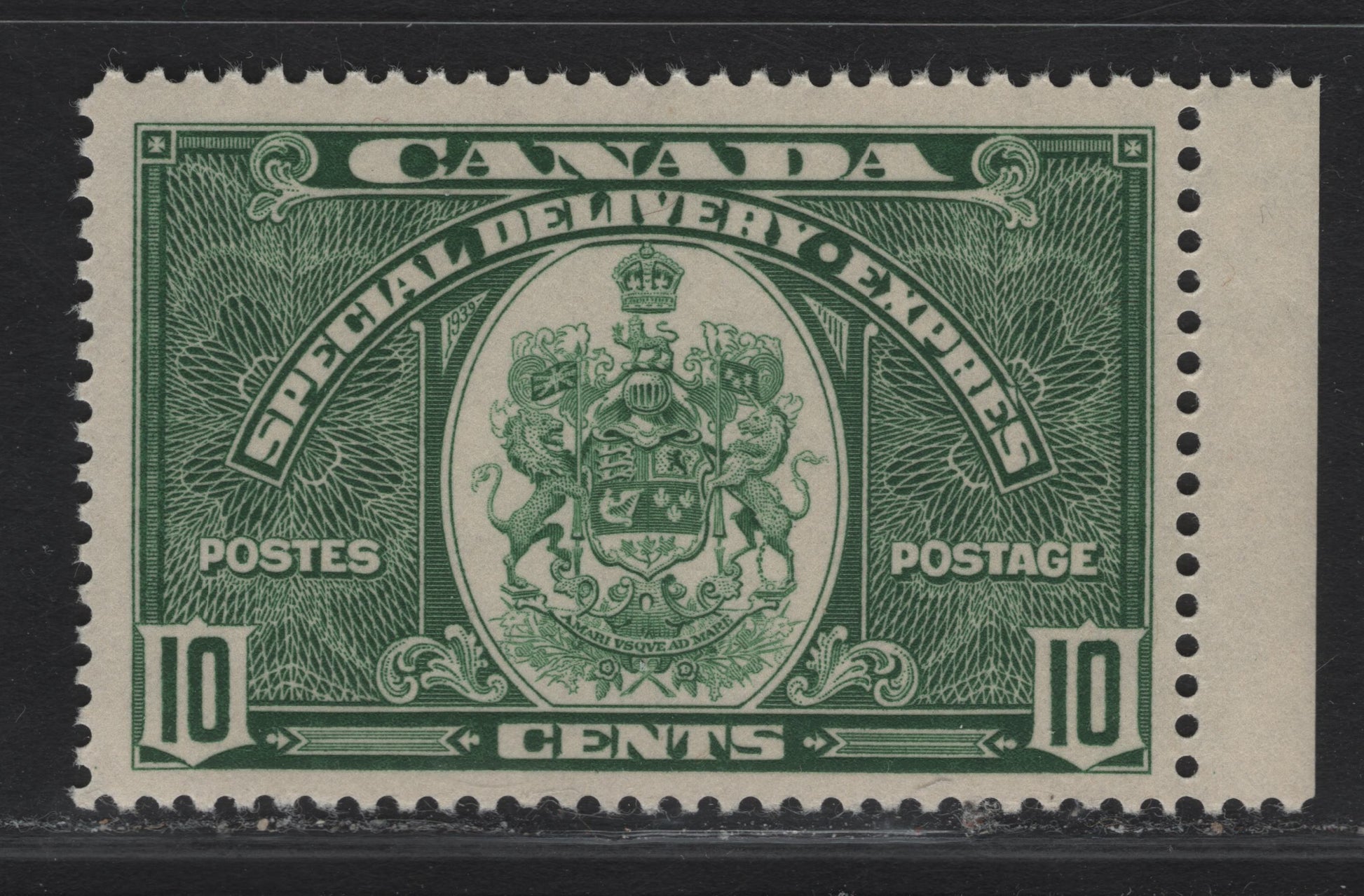 Lot 341 Canada #E7 10c Deep Green Emblem, 1939 Special Delivery Issue, A FOG Single, Paper/Gum CBN-KK, Perf 11.9