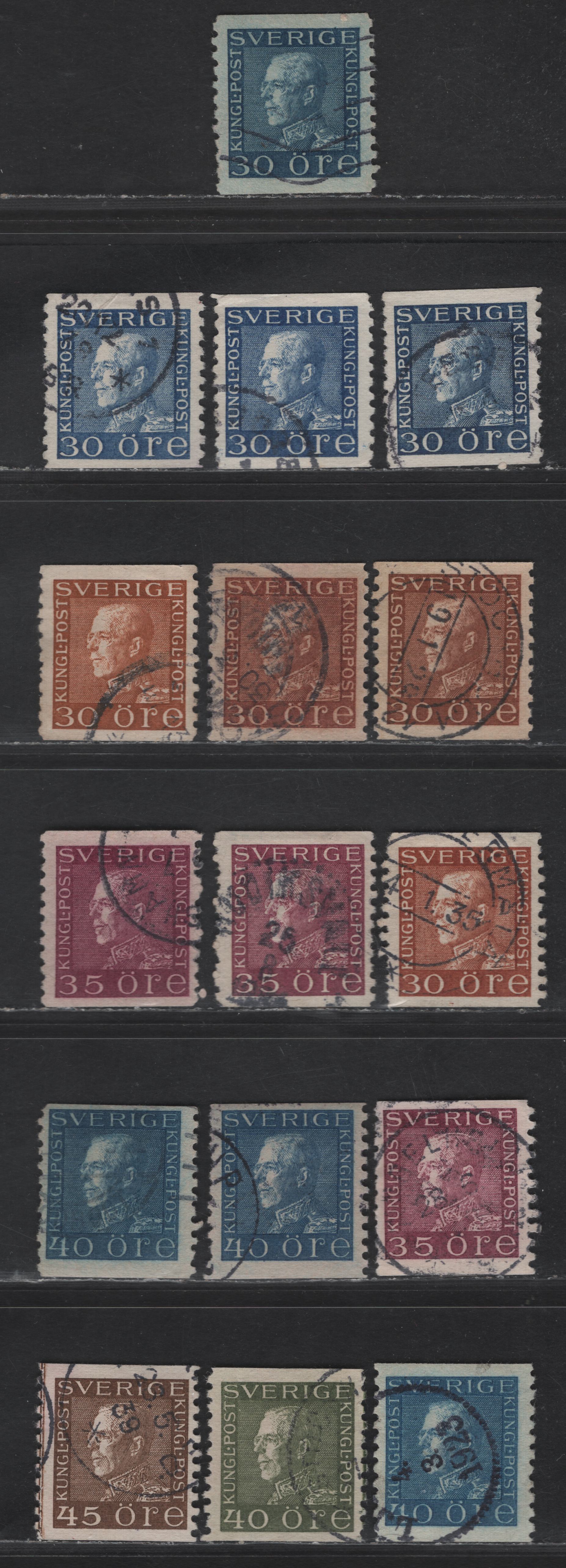 Lot 347 Sweden SC#178-184 (Facit # 185a,c, 186a-c, 187a-c, 188a-b, 189b, 191b) 30o - 45o Greenish Blue - Brown King Gustav V, 1921-1936 King Gustav V Issue, 16 Fine/Very Fine Used Singles, Specialized Group Of Shades On Facit Listed Papers